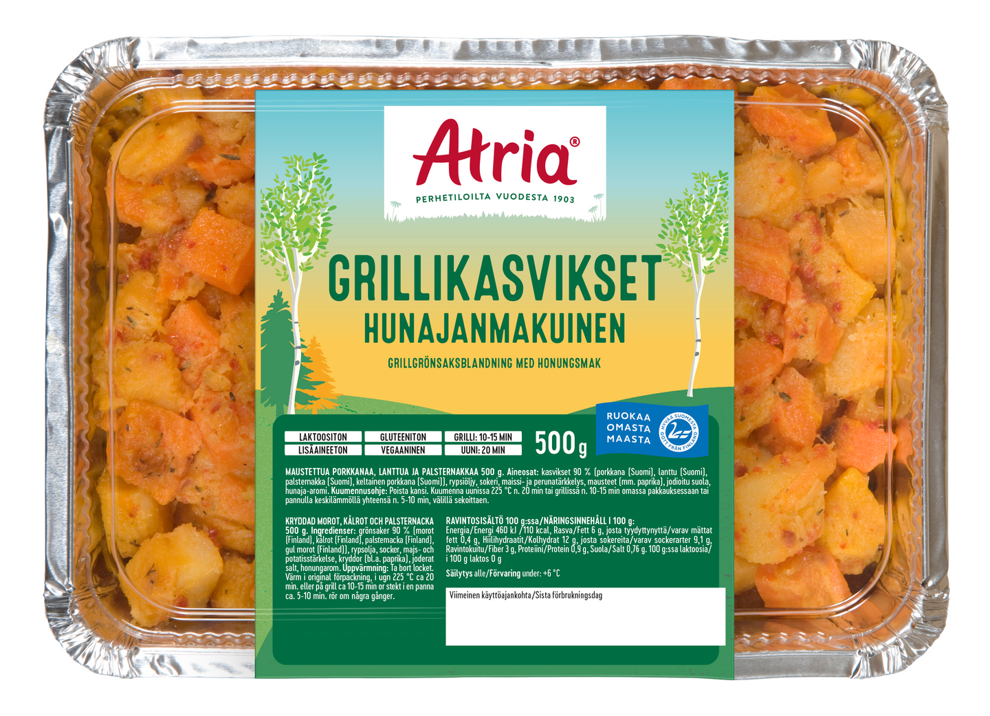 VegaaninenGrillikasvikset sisältävät porkkanaa, lanttua ja palsternakkaa, niiden makumaailma on sävytetty hunajalla, joten ne sopivat hyvin lihan, kanan, kalan ja grillijuuston lisukkeeksi. Grillikasvikset ovat helppo valmistaa grillissä, uunissa tai jopa pannulla. Atrian grillikasvikset ovat pakattu alumiiniseen uunivuokaan, joka sopii kasvisten lämmittämiseen niin grillissä kuin myös uunissa.