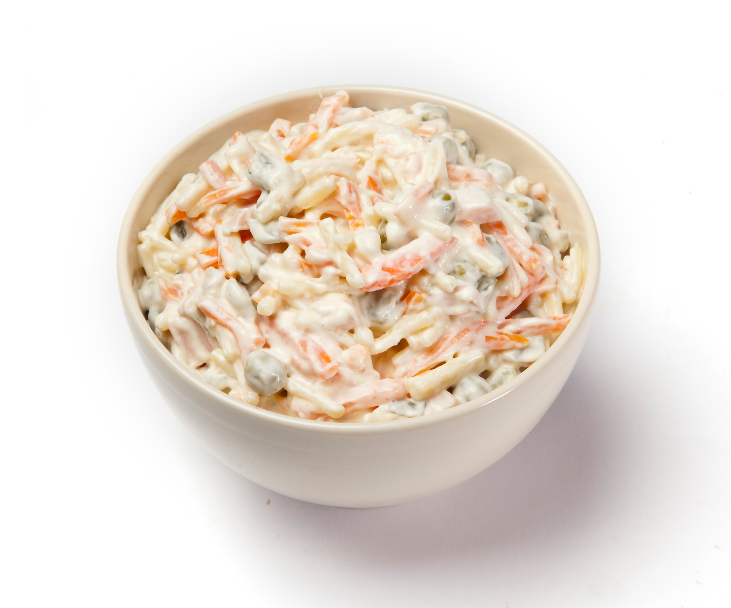 majoneesi (rypsiöljy, vesi, sokeri, etikka, sinappi (vesi, sokeri, SINAPINSIEMEN, etikka, jodioitu suola, rypsiöljy, väri sokerikulööri, säilöntäaine natriumbentsoaatti, valkopippuri), KANANMUNANKELTUAINEN, muunnettu maissitärkkelys, jodioitu suola, sakeuttamisaine ksantaanikumi, säilöntäaineet (kaliumsorbaatti, natriumbentsoaatti), aromi), spagetti (VEHNÄ), porkkana, säilykekurkku (kurkku, etikka, suola, sokeri, aromit (mm. SINAPINSIEMEN), makeutusaine sakariini), leikkelemakkara 7 % (viljaporsaanliha, vesi, silava, perunatärkkelys, kamara, jodioitu suola, dekstroosi, säilöntäaine natriumnitriitti, mausteet (mustapippuri, chili), aromi), herne, jodioitu suola. Viljaporsaanlihan alkuperä Suomi