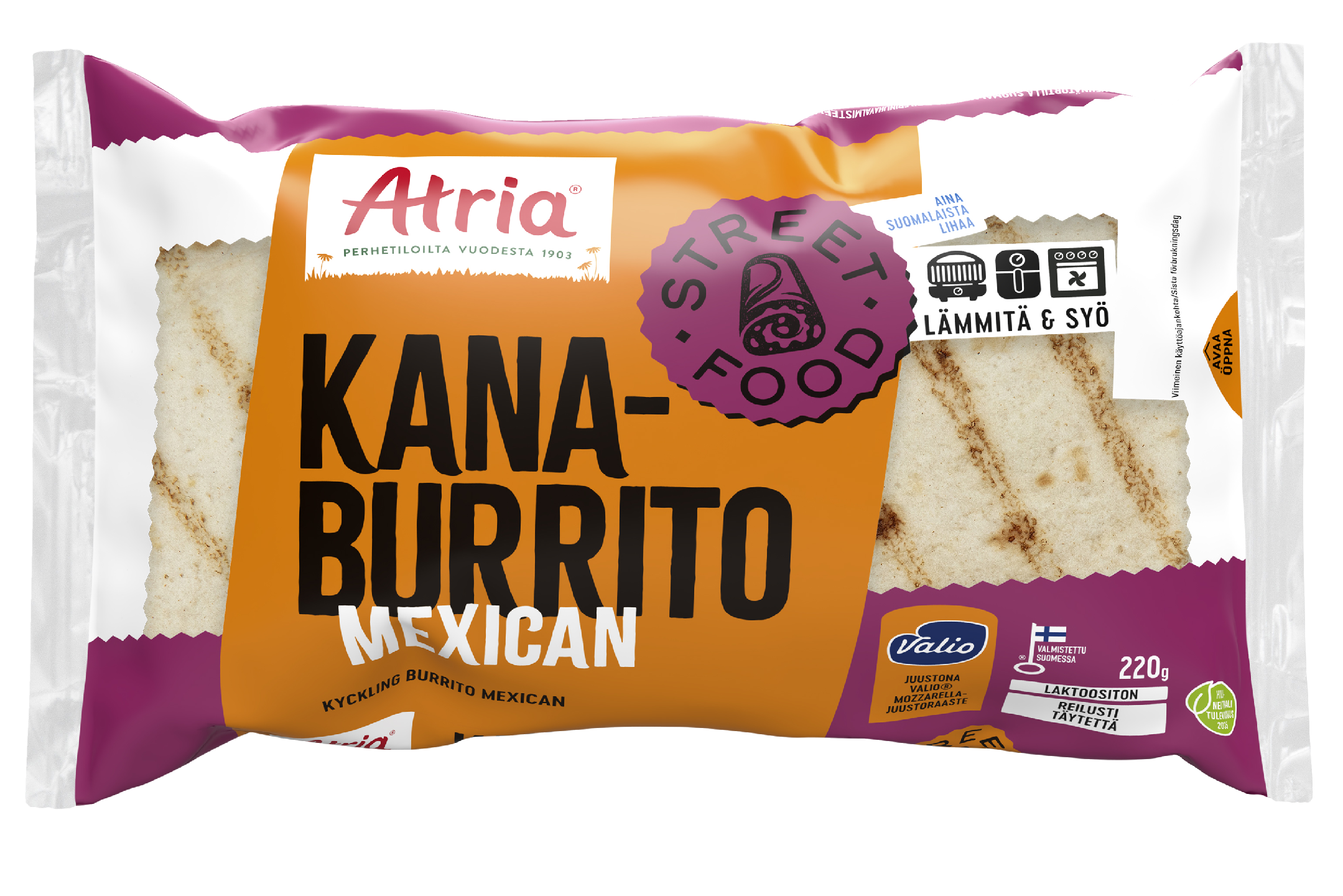 LaktoositonAtria Kanaburrito Mexican 220g on valmiiksi kääritty täytetty tortilla, joka on helppo ja nopea ratkaisu välipala- ja herkutteluhetkiin. Burritossa on runsaasti maukasta täytettä, suomalaista kanaa, Valion mozzarellajuustoa ja maissia ja marinoitua punasipulia. Parhaimmillaan burrito on parilalla lämmitettynä, mutta sen lämmittäminen onnistuu myös uunissa tai airfryerissä ja kiireessä lämmitys onnistuu myös mikrossa. Helppoihin Street Food herkkuhetkiin.