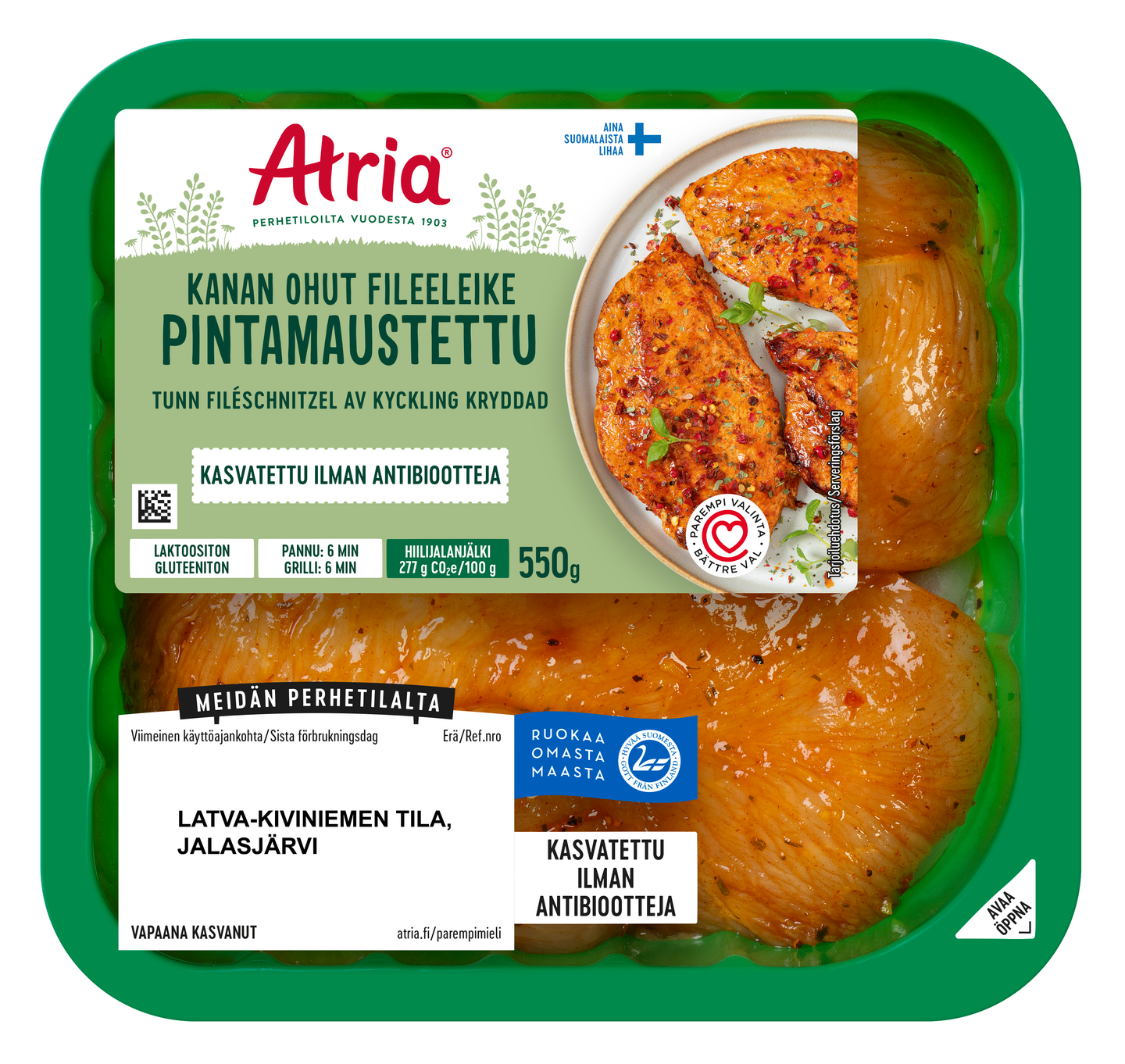 LaktoositonKevyesti pintamaustettu Atria kanan ohut fileeleike sopii todella moneen kanaruokaan. Aina herkullisista ja täyteläisistä kastikkeista erilaisiin eksoottisiin ruokiin, kuten fajitaksiin tai tortilloihin. Kypsennyksen jälkeen viilennettynä sopii myös mainiosti salaatin joukkoon. Erityisen hyvää kanan fileeleikkeestä tulee grillissä ja valmiiksi pintamaustettuna se sopiikin valmistettavaksi sellaisenaan. Kana on erinomainen grilliherkku esimerkiksi maissin kanssa tarjoiltuna. Antibioottivapaa-merkintä pakkauksessa kertoo, että eläimet eivät ole tarvinneet ainuttakaan antibioottikuuria elämänsä aikana.