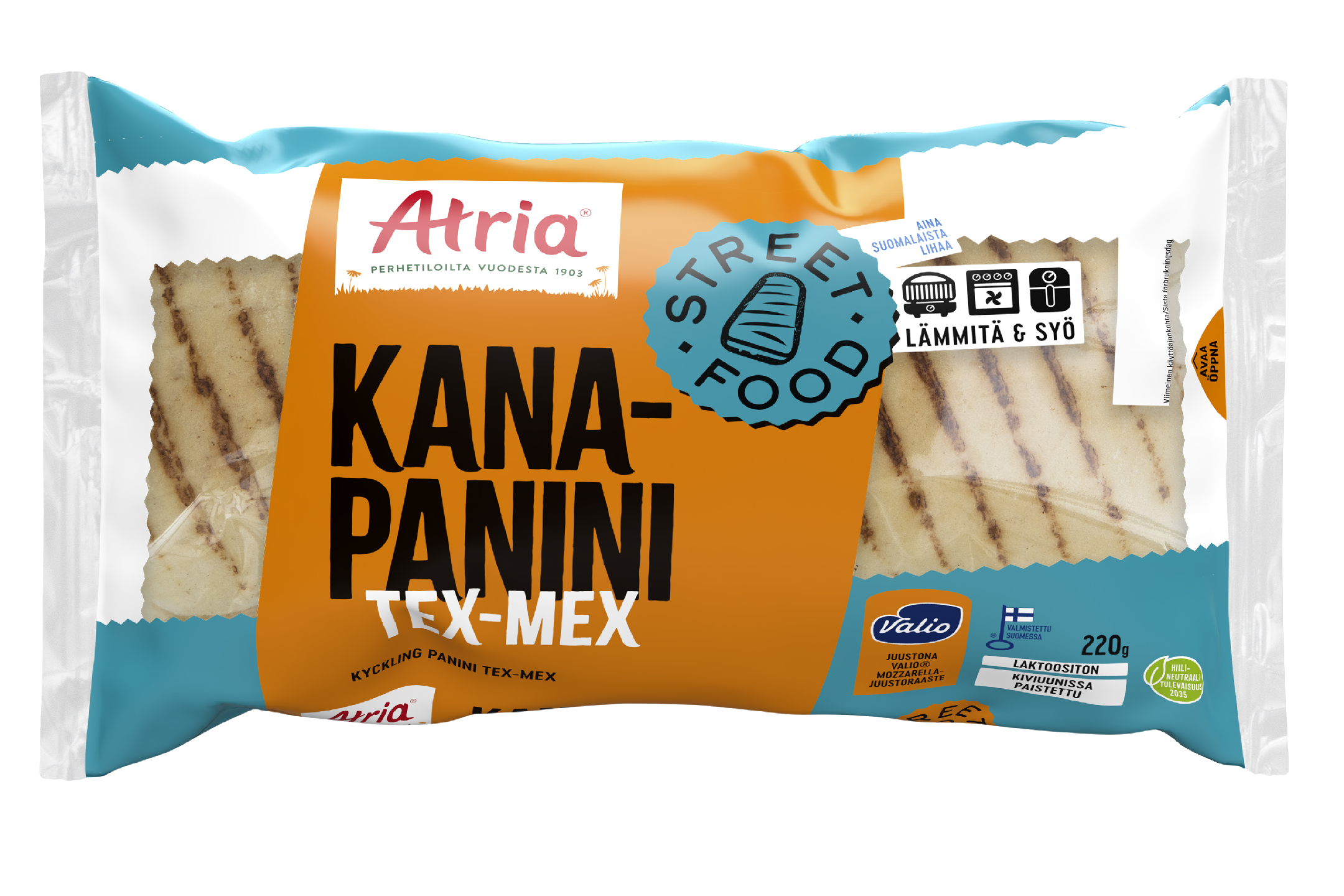 LaktoositonAtria Kanapanini Tex-Mex on lämmitettävä Street Food leipä. Se on kuohkea, kiviuunipaistettu ciabattaleipä, jossa on runsaasti mehukasta täytettä. Täytteeseen täyteläisyyttä tuo Valion Mozzarella-Juusto. Suomalaisen kanan maustaa kiehtovat tex-mex maut. Atria Tex-Mex Kana Panini on tarkoitettu lämmitettynä nautittavaksi. Parhaimmillaan Panini on parilalla lämmitettynä, mutta sen lämmittäminen onnistuu myös uunissa tai airfryerissä ja kiireessä lämmitys onnistuu myös mikrossa. Pakkauksen voi kierrättää muovinkeräykseen.