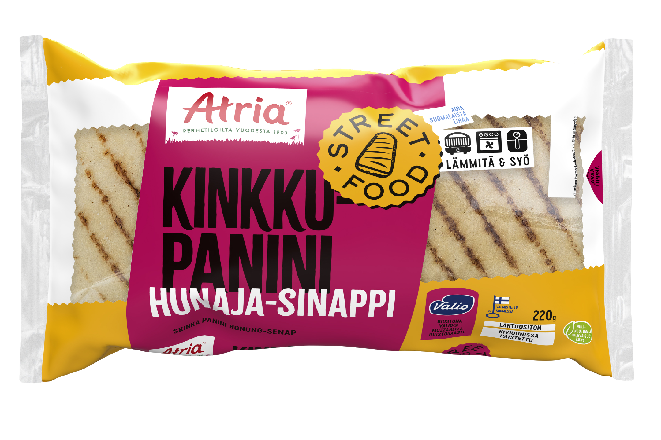 Atria Kinkkupanini Hunaja-Sinappi on lämmitettävä, kuohkea, kiviuunipaistettu ciabattaleipä, jossa on runsaasti mehukasta täytettä. Täytteeseen täyteläisyyttä tuo Valion Mozzarella-Juusto. 'Suomalaisen Kinkun maustaa klassinen hunaja-sinappitäyte. Atria Kinkkupanini Hunaja-Sinappi on lämmitettynä nautittavaksi tarkoittu Street Food herkku. Parhaimmillaan Panini on parilalla lämmitettynä, mutta sen lämmittäminen onnistuu myös uunissa tai airfryerissä ja kiireessä lämmitys onnistuu myös mikrossa. Pakkauksen voi kierrättää muovinkeräykseen.