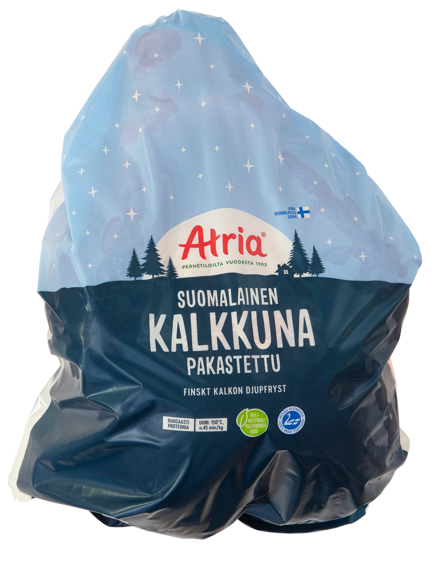 Atrian kokonainen kalkkuna sopii erilaisiin juhlapöytiin. Anna kalkkunan sulaa hitaasti jääkaapissa omassa pakkauksessaan. Sulatus voi viedä 2-3 päivää. Ota kalkkuna ajoissa ennen paistamista huoneenlämpöön. Kuivaa kalkkuna sekä sisältä että ulkoa. Hiero sisä- ja ulkopintaan sekä nahan alle sitruunaa, suolaa ja pippuria. Laita kalkkuna selkäpuoli alaspäin uuniritilälle, jonka alla on reunallinen uunipannu ja siinä vesitilkka. Kypsennä 150°C:ssa uunissa. Käytä lihalämpömittaria. Kalkkuna on kypsä, kunnes sisälämpötila on 75-80°C. Tällöin myös pistettäessä tihkuva lihasneste on kirkasta. Varaa paistoaikaa noin 45 min/kg. Voitele kalkkunaa paiston aikana voisulalla. Anna vetäytyä n. 10 min ennen tarjoilua. Voit käyttää siivilöidyn liemen kastikkeen valmistukseen. Eläinten hyvinvoinnista huolehditaan valvotusti Atrian koko ruokaketjussa.