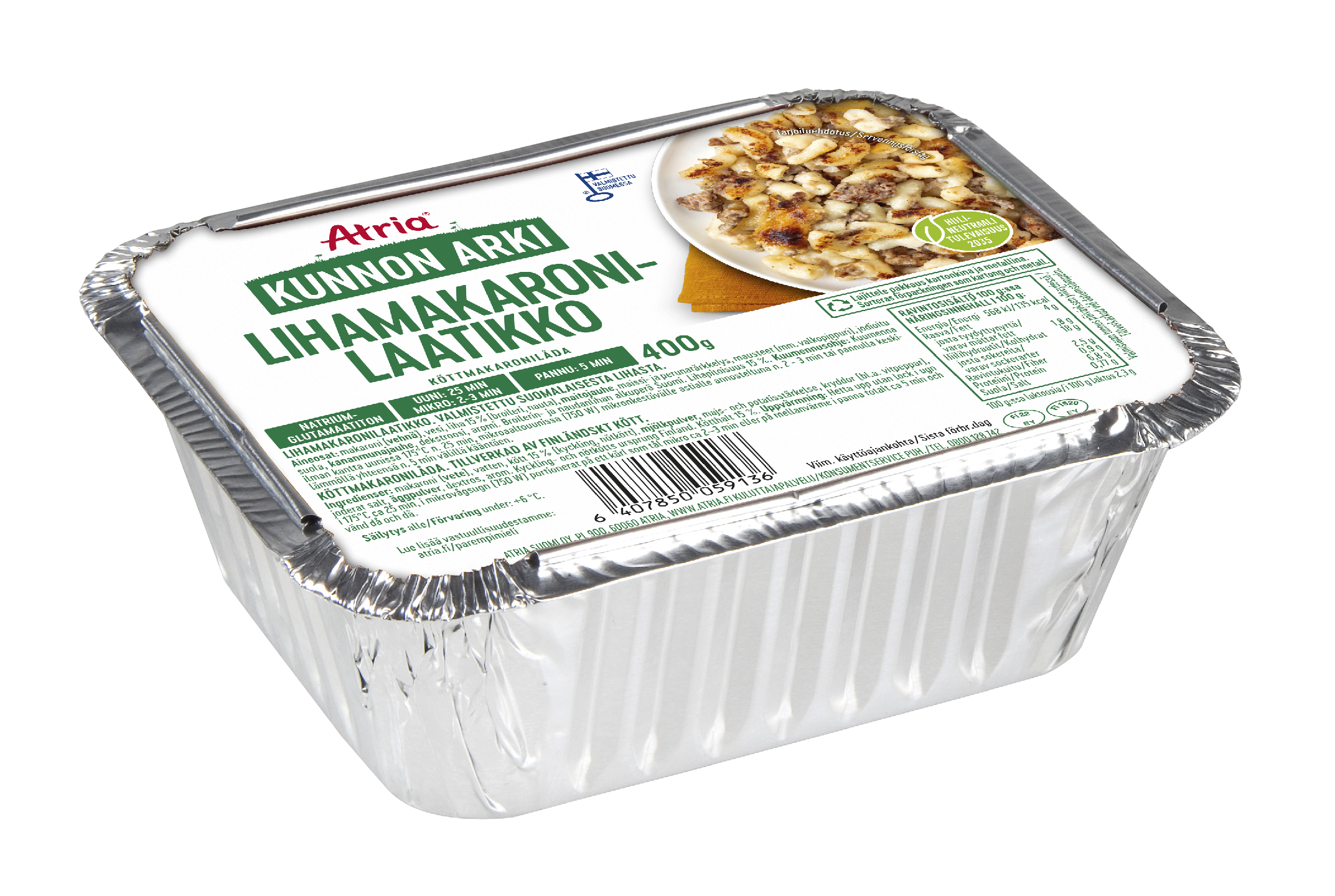 Lihamakaronilaatikko on perinteinen suomalainen arkiruoka. Se on yksi lasten suosikkiruuista. Atrian Kunnon Arki -sarjan lihamakaronilaatikko on valmistettu suomalaisesta lihasta ja makaronista. Lihamakaronilaatikko syödään monesti ketsupin kanssa, voit myös tarjoilla tuoreita tomaatteja ja kurkun siivuja aterian lisukkeeksi. Lämmitä lihamakaronilaatikko uunissa ilman kantta omassa pakkausrasiassaan. Lämmitys onnistuu myös mikroaaltouunissa, siirrä ruoka ensin mikron kestävään astiaan. Voit lämmittää makaronilaatikon myös pannulla.