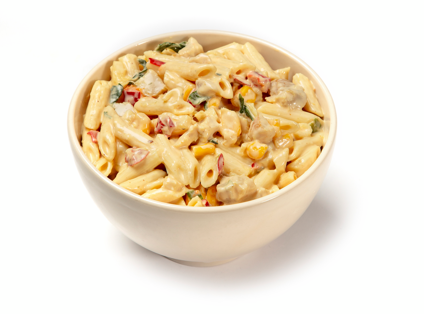 makaroni (DURUMVEHNÄ), mangomajoneesi (rypsiöljy, vesi, sokeri, etikka, sinappi (vesi, sokeri, SINAPINSIEMEN, etikka, jodioitu suola, rypsiöljy, väriaine sokerikulööri, säilöntäaine natriumbentsoaatti, valkopippuri), KANANMUNANKELTUAINEN, muunnettu maissitärkkelys, jodioitu suola, mangosose, mausteet (paprika, chili ancho, korianteri, mustapippuri, fenkoli, inkivääri, ruohosipuli, kurkuma, kumina, kaneli, sarviapila, kardemumma), mangojauhe, sakeuttamisaine ksantaanikumi, säilöntäaineet (kaliumsorbaatti, natriumbentsoaatti), aromit), broilerin grillattu reisikuutio 12 % (broilerin reisiliha, vesi, jodioitu suola, stabilointiaineet (E 450, E 451). Broilerinlihan alkuperä Suomi), ananas, maissi, paprika, purjosipuli