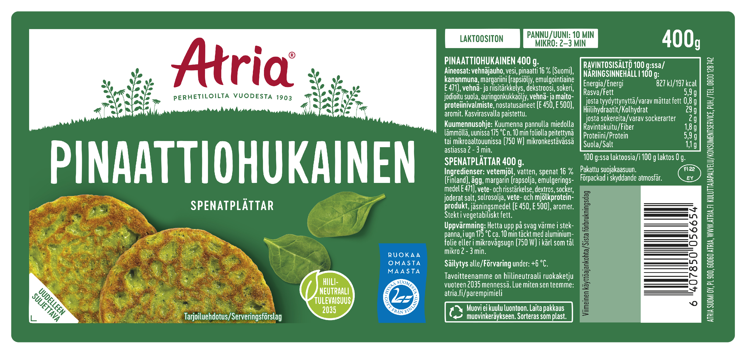Perinteiset pinaattiohukaiset ovat lasten suosikkiruokaa. Atrian pinaattiohukaiset ovat paistettu valurautapannulla. Tarjoile ohukaiset hillon tai suolaisen täytteen kanssa. Pinaattiohukaiset ovat mainio välipala tai kevyt lounas. Suolaisen täytteen kanssa voi tarjoilla ruokaisempaa majoneesipohjaista salaattia. Atrian valmiit pinaattiohukaiset ovat lämmitystä vailla valmiita. Voit kuumentaa ohukaiset pannulla miedossa lämmössä, uunissa foliolla peitettynä tai mikroaaltouunissa.