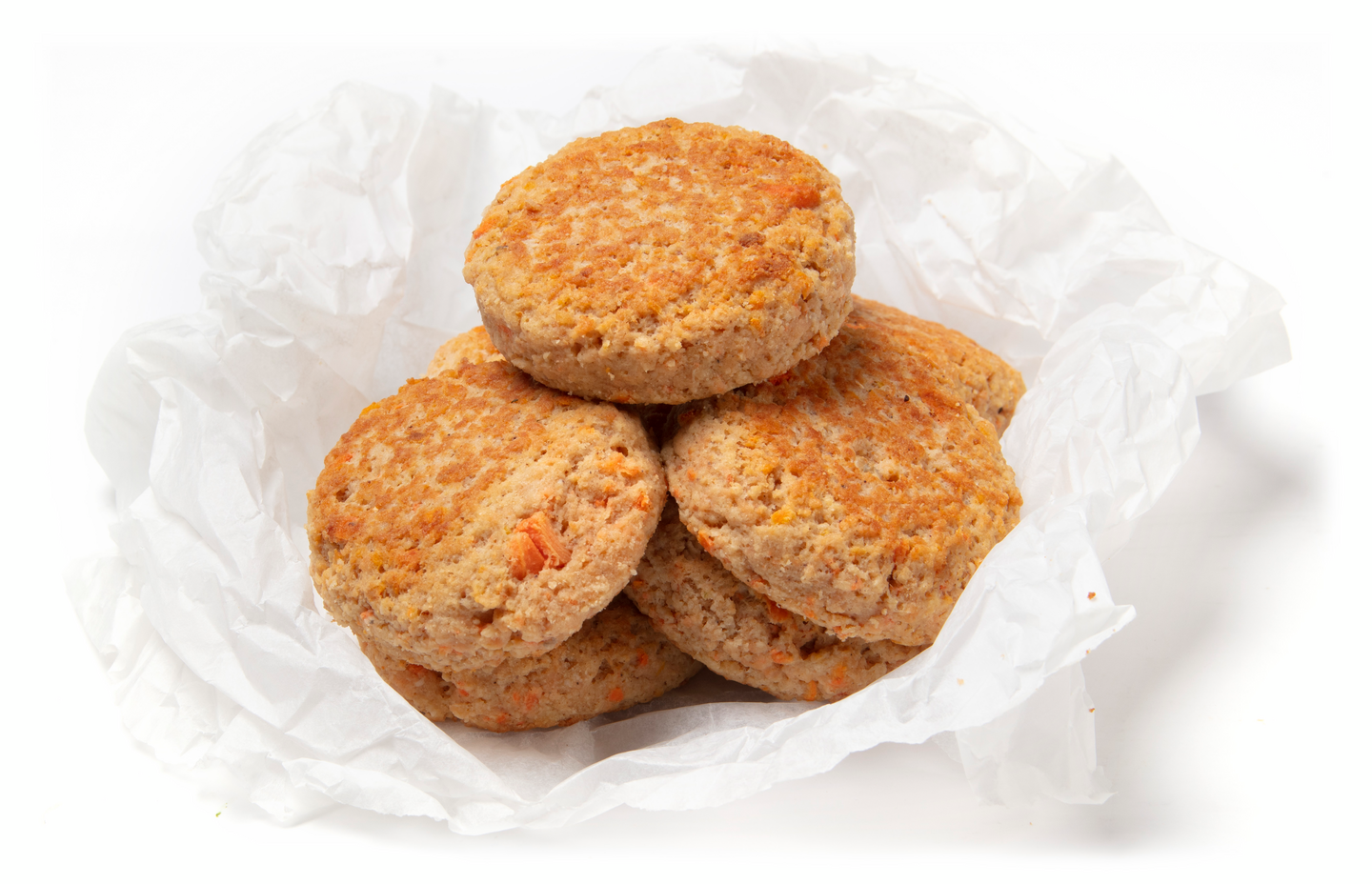 KIRJOLOHI 65 % (Oncorhynchus mykiss, kasvatettu, Suomi), KANANMUNA, porkkana, perunahiutale, laktoositon KERMA, perunajauho, sitruunankuori, mineraalisuola (suola, kaliumkloridi), mausteet (valko-, musta- ja maustepippuri), rapsiöljy
