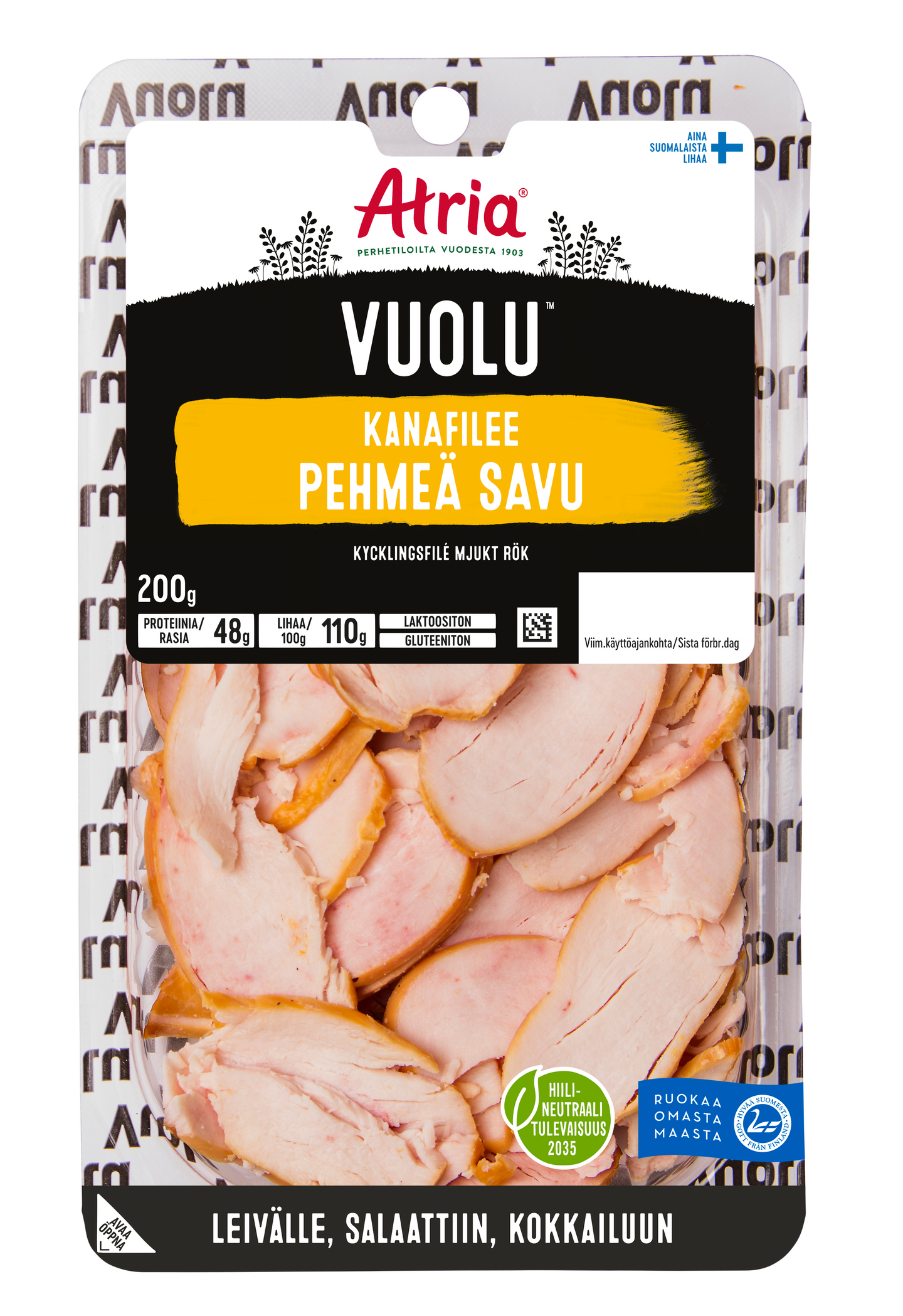 Miedosti maustettu ja pehmeän savuinen Atria Vuolu Kanafilee Pehmeä Savu. Kypsät fileevippaleet ovat valmiit tarjottavaksi sellaisenaan esimerkiksi naposteluvälipalana, mutta ne sopivat myös mainiosti esimerkiksi tortillakääröihin, salaatteihin ja voileipiin. Atrian liha on aina taatusti suomalaista lihaa, suomalaisilta tiloilta.