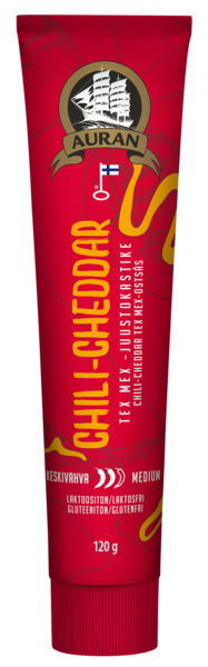 LaktoositonAuran Chili-cheddar juustokastike on täyteläisen juustoinen, sopivasti tulinen, gluteeniton ja laktoositon herkku. Auran Chili-cheddar juustokastike sopii täydellisesti tex mex -ruokiin, hampurilaisiin, dippaukseen, perusruokien tuunaamiseen, leivän päälle ja annosten viimeistelyyn.