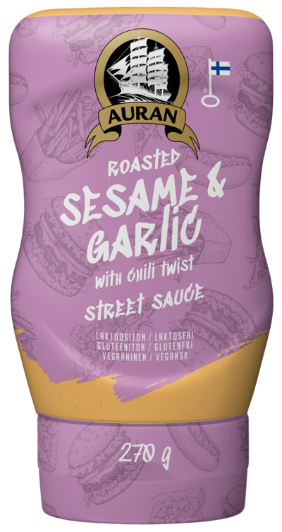 VegaaninenAuran Roasted sesame & garlic street sauce katuruokien uusi täsmämauste! Tämä täyteläinen majoneesipohjainen kastike yhdistää paahdetun seesamin syvän aromin, valkosipulin intensiivisyyden ja chilin lempeän potkun. Täydellinen aasialaistyylisiin annoksiin kuten bao-sämpylöihin, nuudelibowleihin tai vaikka rapeisiin kanapaloihin.