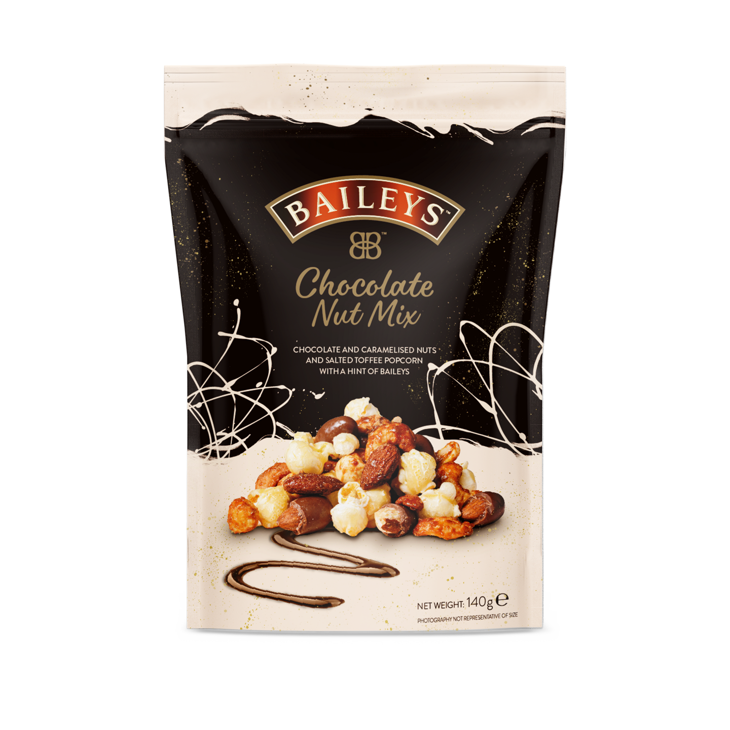 Jännittävä sekoitus tekstuureja ja makuja! Baileys-suklaalla päällystetyt mantelit, suolattu toffee-popcorn, karamellisoidut pähkinät (mantelit, cashewpähkinät, maapähkinät ja hasselpähkinät) sekä aavistus Baileysin makua uudelleensuljettavassa ja kierrätettävässä doy-pussissa.