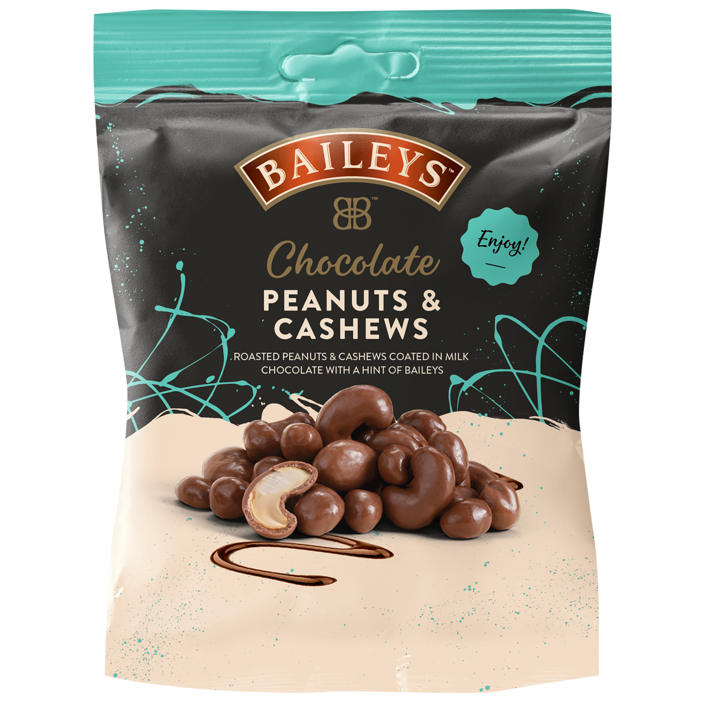 Herkullisella maitosuklaalla päällystettyjä paahdettuja maapähkinöitä ja cashewpähkinöitä, mukana häivähdys Baileysin makua.