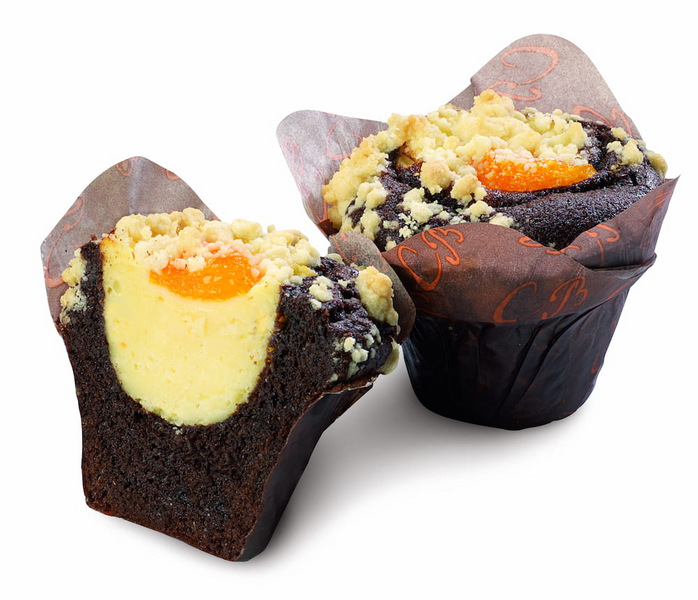Suklaamuffinssi pehmeällä rahkatäytteellä, koristeltu tangeriinilla ja crumblella.