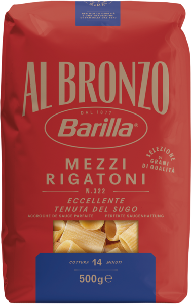 Pronssimuotilla valmistetussa Barilla Al Bronzo -pastassa on käytetty vain huolella valittua durumvehnää. Erikoispronssimuotti antaa pastalle täyteläisen koostumuksen ja vahvan tekstuurin: pastan karhean pinnan ansiosta pastakastikkeet tarttuvat siihen paremmin. Tyylikäs pakkaus, Mezzi Rigatoni pastan kultainen meripihkainen väri sekä ainutlaatuinen maku houkuttelevat maistamaan kaikkia pastamuotoja.