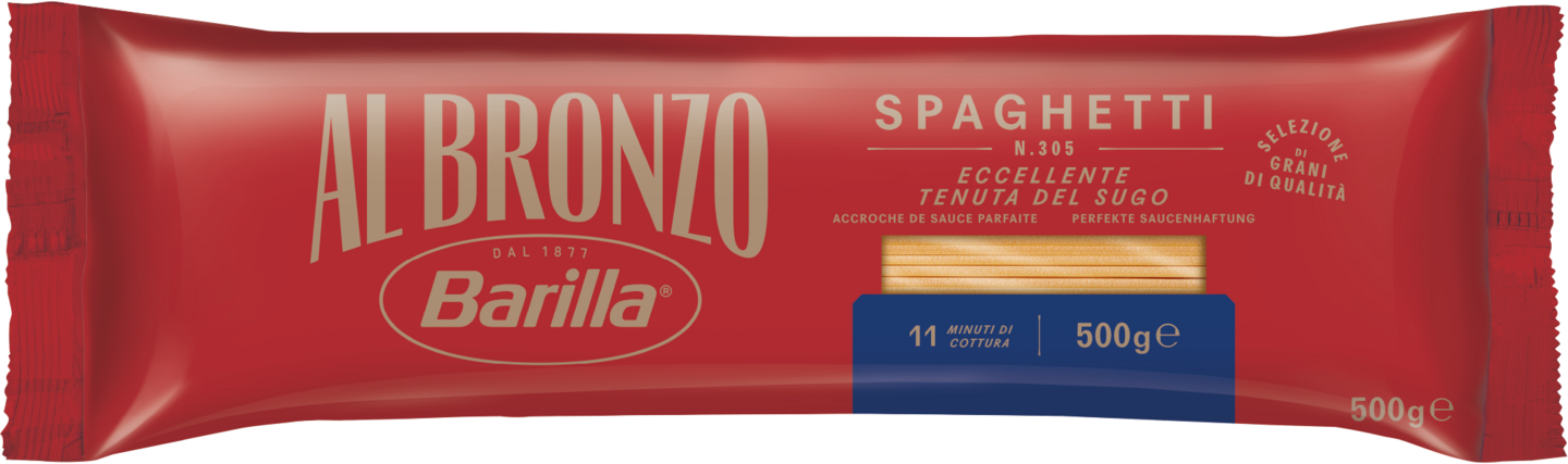 Pronssimuotilla valmistetussa Barilla Al Bronzo -pastassa on käytetty vain huolella valittua durumvehnää. Erikoispronssimuotti antaa pastalle täyteläisen koostumuksen ja vahvan tekstuurin: pastan karhean pinnan ansiosta pastakastikkeet tarttuvat siihen paremmin. Tyylikäs pakkaus, spagettin kultainen meripihkainen väri sekä ainutlaatuinen maku houkuttelevat maistamaan kaikkia pastamuotoja.
