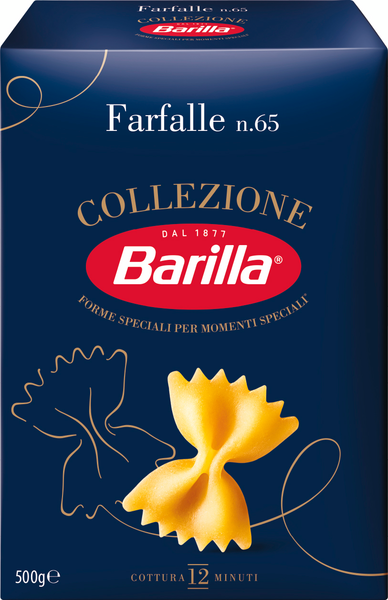 Barilla Collezione Farfalle n. 65 on elegantti perhosen muotoinen pasta, joka tuo ripauksen juhlavuutta arkiruokailuun. Valmistettu 100 % durumvehnästä, tämä laadukas pasta sopii erinomaisesti kevyisiin kastikkeisiin, salaatteihin tai jopa kylmiin pastaruokiin.