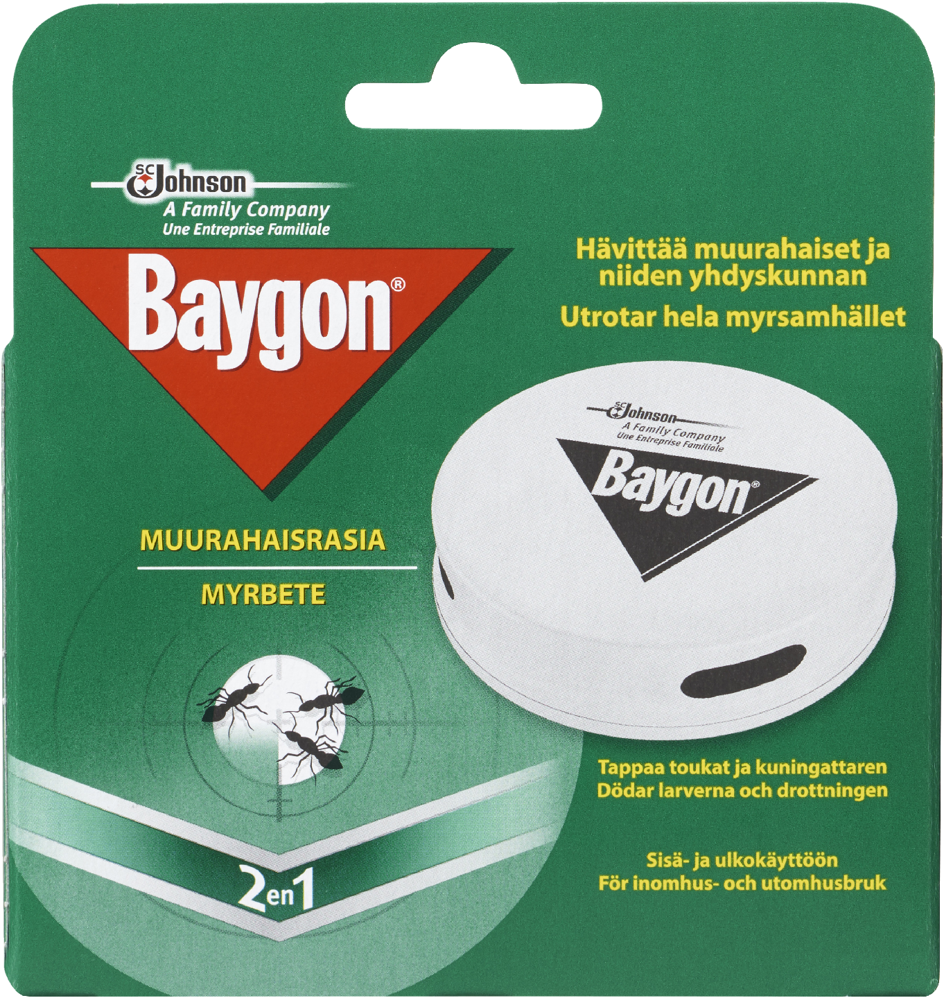 Baygon muurahaisrasia on tarkoitettu sokerimuurahaisten torjuntaan asuinrakennuksista ja niihin liittyviltä alueilta, kuten parvekkeilta ja terasseilta. Valmiste on käyttövalmis syötti, jota käytetään sisä- ja ulkotiloissa. Syöttejä sijoitetaan muurahaispesän läheisyyteen tai suoraan niiden kulkureiteille. Populaatio häviää 3–4 viikon kuluessa. Baygon muurahaisrasia soveltuu käytettäväksi sisällä olohuoneissa ja makuuhuoneissa sekä ulkona terasseilla ja parvekkeilla.Rasiassa oleva makea neste houkuttelee muurahaisia, jotka vierailevat syötissä ja kuljettavat massaa ruoaksi myös pesään tuhoten samalla muurahaisyhdyskunnan. Muurahaisrasia asetetaan sellaiseen paikkaan, missä muurahaiset liikkuvat ja minne ne piiloutuvat. Parhaan tehokkuuden saavuttamiseksi ja mikäli muurahaisongelma on suuri, käytä useita rasioita samanaikaisesti. Tuote on tuoksuton ja siisti käyttää.