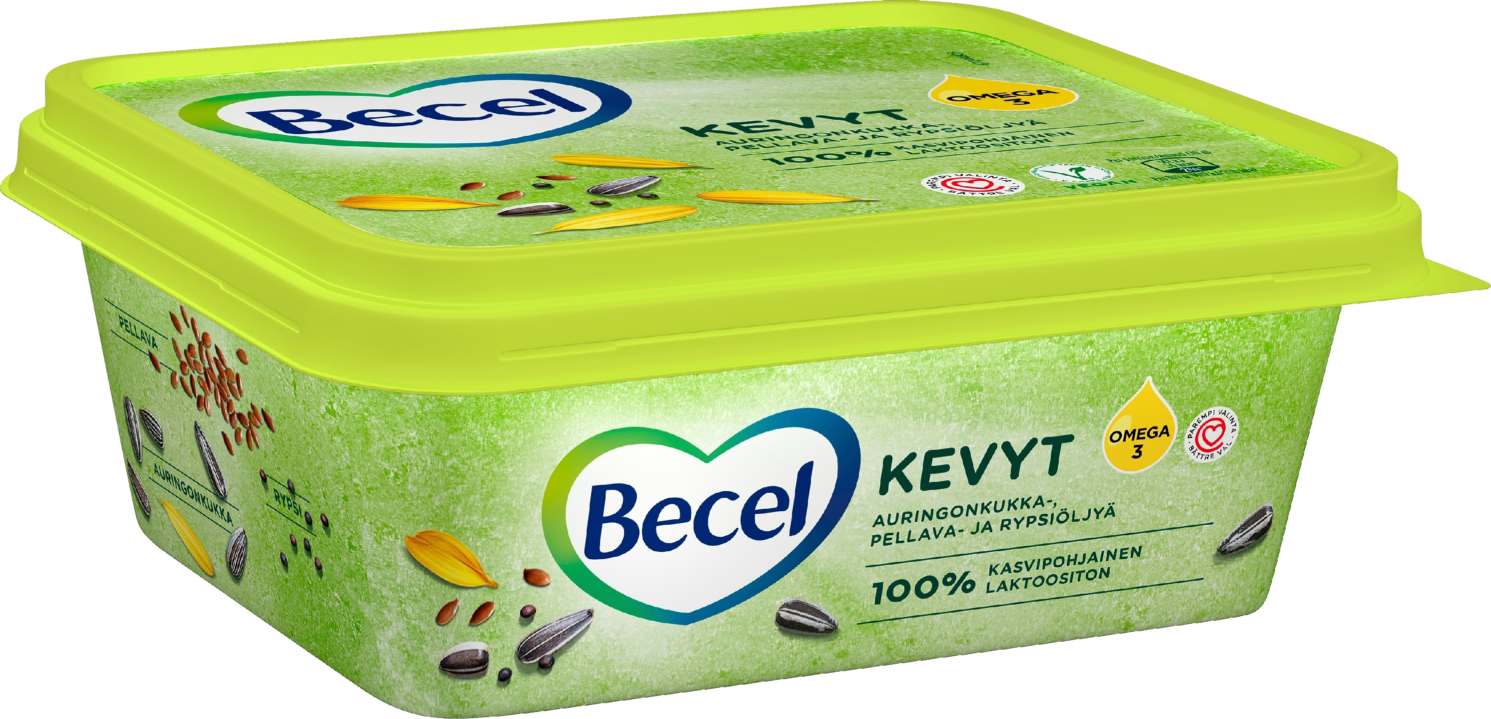 VegaaninenBecel Kevyt kasvirasvalevite on valmistettu auringonkukka-, rypsi- ja pellavansiemenöljyistä ja se sisältää monityydyttymättömiä omega-3- ja -6-rasvoja. Tyydyttyneiden rasvojen korvaaminen tyydyttymättömillä rasvoilla ruokavaliossa edistää veren kolesterolitasojen pysymistä normaalina. Nauti osana terveellistä ja monipuolista ruokavaliota. Laktoosittomassa Becel Kevyt kasvirasvalevitteessä on 38 % rasvaa ja sille on myönnetty Sydänmerkki.