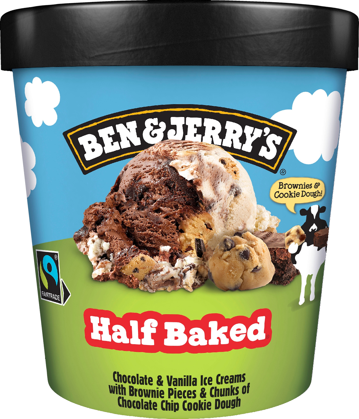 Tässä jäätelössä on tupla-annos makujen euforiaa: herkullinen Cookie Dough on sekoitettu ihanaan Chocolate Fudge Brownieen. Nappaa lusikka käteesi ja nauti! Vanilja-suklaajäätelö keksitaikinan paloilla ja browniesilla on täysin lyömätön yhdistelmä! Ben & Jerry's Half Baked on saanut nimensä, koska itse brownie on paistettu, mutta kakkutaikina ei. Maku on ollut bestseller vuodesta 2000, jolloin päätimme yhdistää klassiset jäätelöluomuksemme – Cookie Dough ja Chocolate Fudge Brownie. Edellinen, Cookie Dough, jossa on suuria keksitaikinan paloja vaniljajäätelön ympäröimänä, syntyi vuonna 1986 fanin anonyyminä makuehdotuksena. Lanseeraus tapahtui viisi vuotta myöhemmin ja on edelleen sensaatiomaisen suosittu makuelämys. Chocolate Fudge Brownie on suosittu jäätelömaku jossa on ihanaa suklaajäätelöä ja superhyvää Greyston Bakeryn valmistamaa brownieta. Se on tyydyttänyt suklaan ystävien jäätelön nälkää jo vuodesta 1991. Joskus on vaikea valita näiden kahden legendaarisen maun välillä. Half Bakedin kanssa sinun ei tarvitse. Saat molempien maailmojen parhaat puolet samassa –Vanilja-suklaajäätelö keksitaikinan paloilla ja browniesilla on lyömätön yhdistelmä!Kaikki alkoi siitä, kun kaksi kaveria alkoi myydä Vermontin Burlingtonissa sijaitsevasta kunnostetusta huoltoasemasta jäätelöä vuonna 1978. Heidän perustamastaan jäätelöyrityksestä tuli yhtä legendaarinen kuin jäätelöstä itsestään. Se oli seikkailun alku, joka on yhtä myyttinen kuin jäätelömme on hyvää. Jäätelömme tunnetaan nyt syrjäisilläkin seuduilla ja vaikeasti lausuttavilla nimillä ympäri maailmaa. Ben & Jerry's -jäätelön valmistukseen käytetään Reilun kaupan sertifioitua sokeria, kaakaota ja vaniljaa. Lisäksi jäätelö pakataan kestävään ja vastuullisesti tuotettuun pakkaukseen. Jäätelöpakkaus tulee säilyttää -18 °C:ssa tai kylmemmässä.