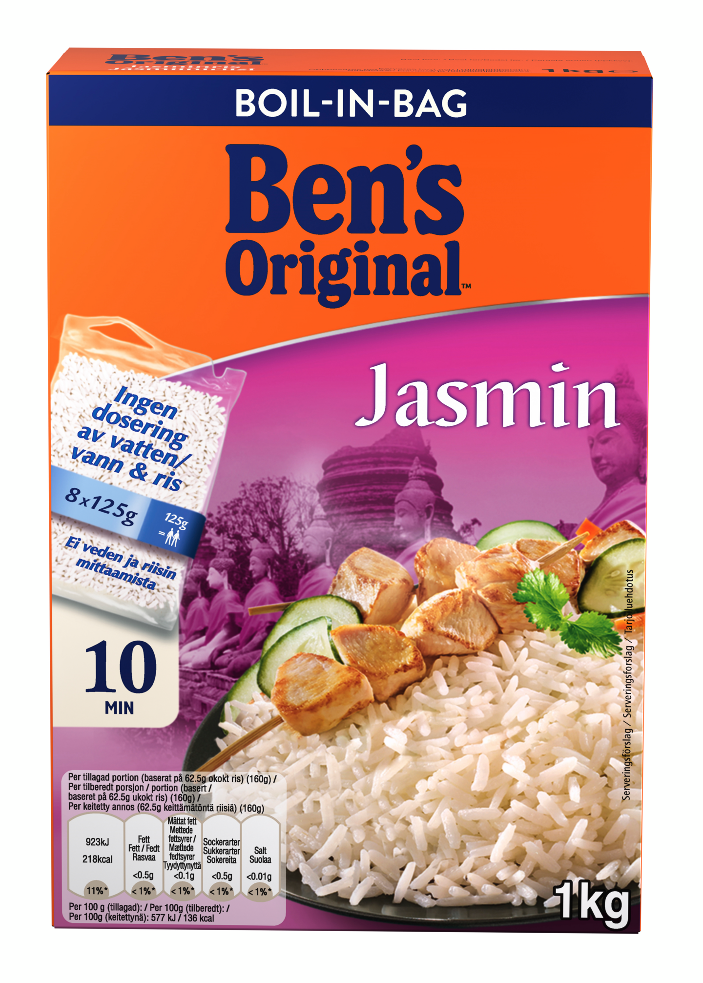 Pitkäjyväinen Ben's Original™ Jasmiinriisi on kaakkoisaasialainen erikoisuus. Sen luonnollinen aromikas tuoksu ja väri sekä kiiltävänvalkoinen hehku tuovat mieleen jasmiininkukat. Kun riisi keitetään, sen hedelmäinen, hieman makea aromi vapautuu. Tämä kevyesti tahmea riisi on oikea valinta kaikkiin eksoottisiin ruokalajeihin. Herkullinen riisi kypsyy vain 10 minuutissa. Keittopussi säästää veden mittaamisen vaivan ja poistaa riisin pohjaan palamisen vaaran.