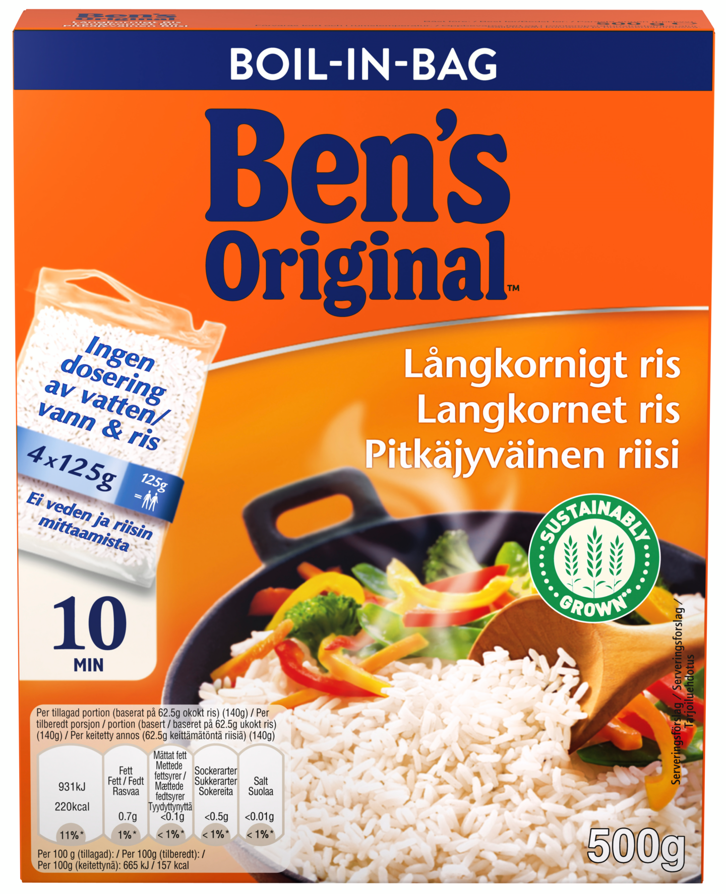 Pitkäjyväinen Ben's Original™ -riisi onnistuu aina täydellisesti. Ja aikaa kuluu vain 10 minuuttia! Keittopussi säästää veden mittaamisen vaivan ja poistaa riisin pohjaan palamisen vaaran.