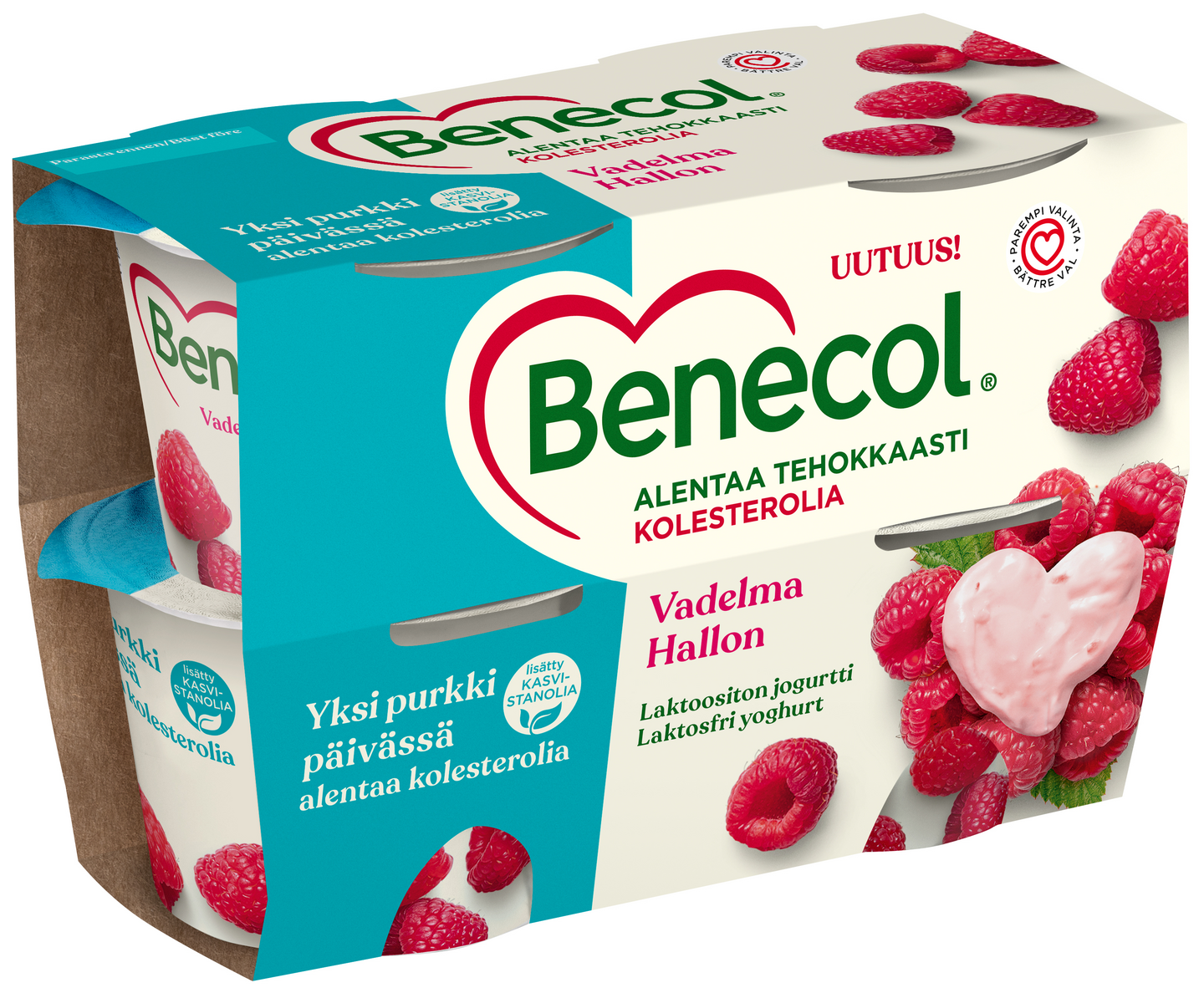 LaktoositonRaikkaan herkullinen Benecol-jogurtti sisältää lisättyä kasvistanolia, joka alentaa kolesteroliasi 2-3 viikossa. Riittävän päiväannoksen kasvistanolia saat yhdestä jogurttipurkista. Pakkauksessa on neljä vadelman makuista jogurttia.