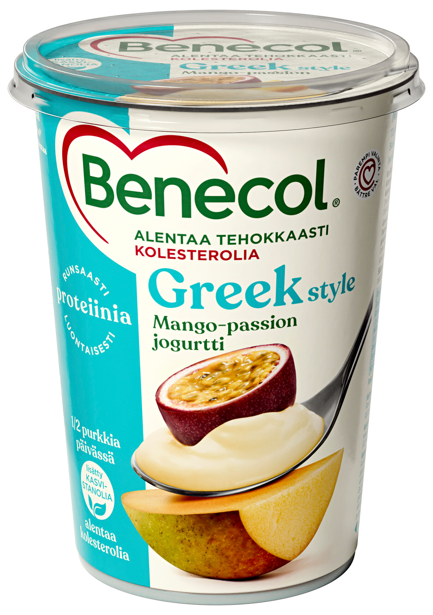 Kreikkalaistyylinen, samettisen täyteläinen Benecol-jogurtti on maustettu aurinkoisella mangolla ja passionhedelmillä. Päiväannoksen kasvistanolia saat puolikkaasta purkista. Sisältää luontaisesti runsaasti proteiinia.