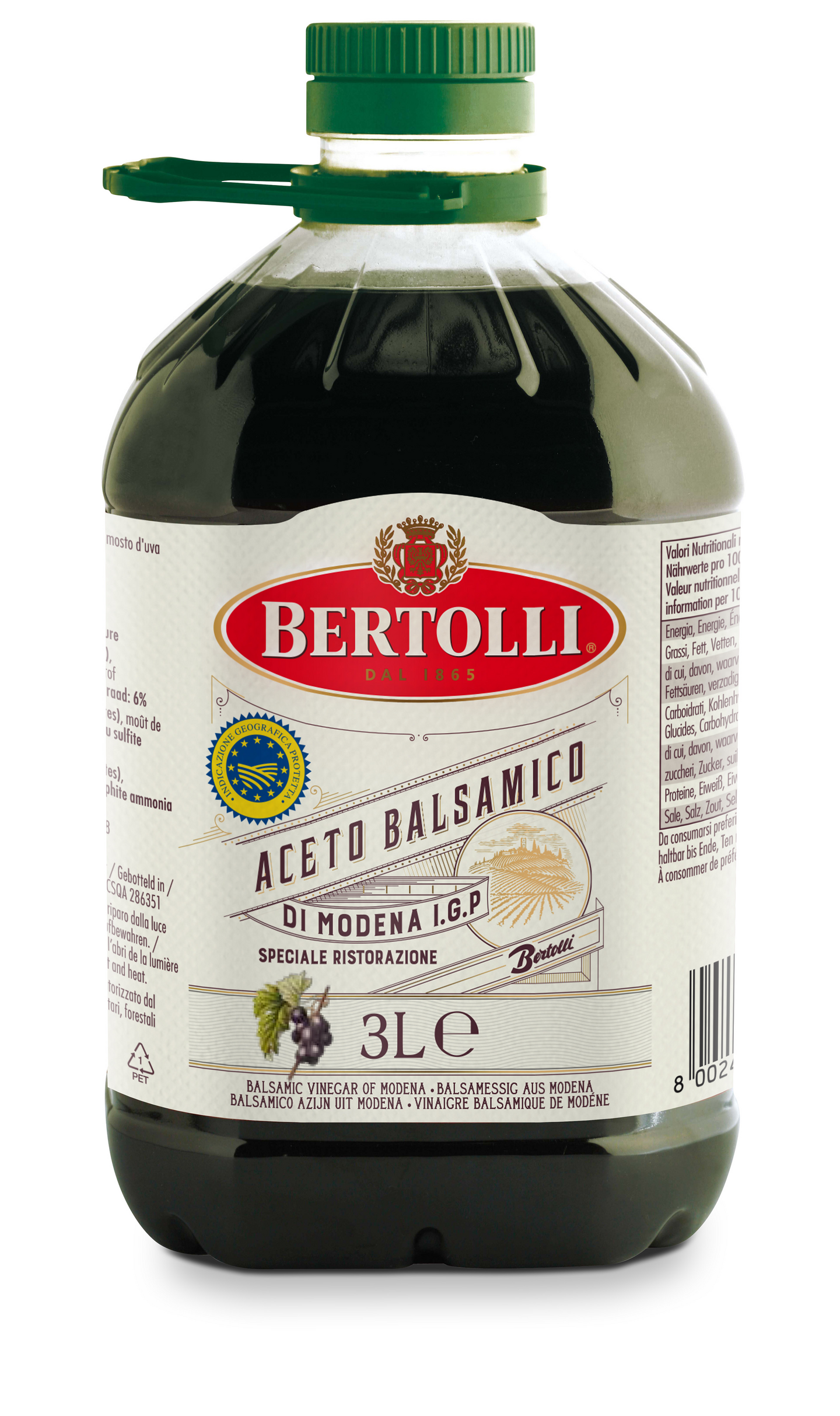 BERTOLLI Aceto Balsamico di Modena I.G.P on balsamiviinietikka, jota tuotetaan yksinomaan Emilia Romagnan alueella (Pohjois-Italia). Sinikeltainen sinetti (Indicazione Geografica Protetta) osoittaa, että tämä tuote on peräisin suojatulta alkuperäalueelta. BERTOLLI Aceto Balsamico di Modena I.G.P on rypälemehun ja viinietikan seos, jota on säilytetty puutynnyreissä vähintään 10 vuotta.