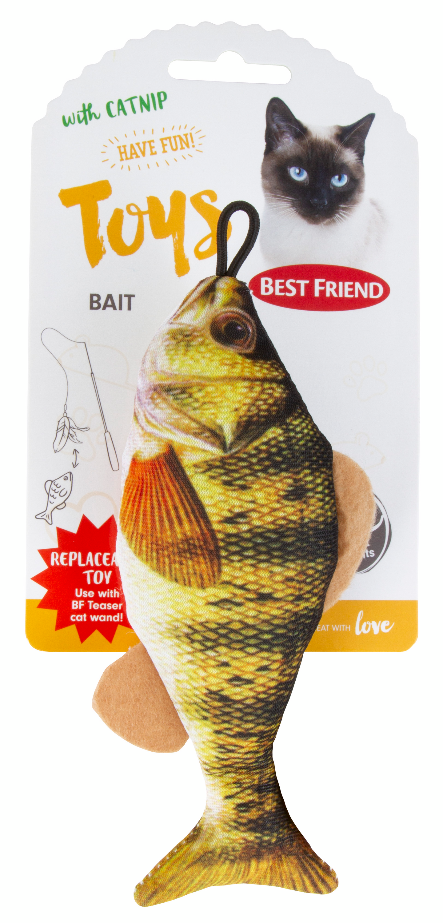 Best Friend Bait on hauska, aidon kalan näköinen lelu kissoille. Lelun sisällä on kuivattua kissanminttua ja houkuttelevasti rapisevaa materiaalia, joka innostaa kissaa leikkimään. Kissa voi leikkiä lelulla sellaisenaan, mutta lelussa on myös lenkki, jolla sen voi kiinnittää Best Friend Teaser kissan onkileluun. Lelun pituus n. 15 cm.