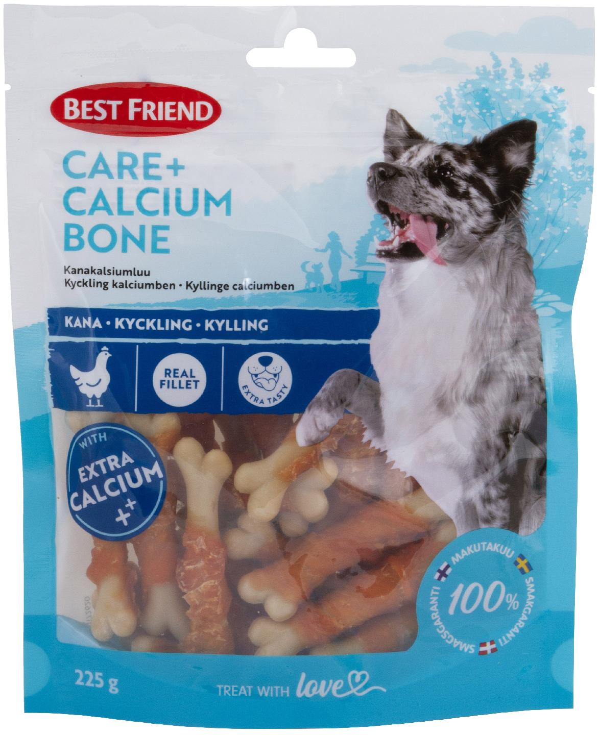 Best Friend Care+ Chicken Calcium Bone kanakalsiumluu koiran herkku on luun muotoinen kasvipohjainen kalsiummakupala aidolla kanafileekääreellä. Tämä rapea koiran makupala on täydellinen päivittäinen palkkio kaikenkokoisille koirille. Lisätty kalsium auttaa tukemaan koirien yleistä hyvinvointia. Tämän koiran herkun rakenne ja korkea kalsiumpitoisuus auttavat myös vähentämään hammaskiveä ja ehkäisemään pahanhajuista hengitystä. Care+ kanakalsiumluu ei sisällä viljaa, lisättyä sokeria eikä lisäaineita, joten se on erinomainen vaihtoehto myös herkille koirille. Kalsiumin lähde on kalsiumkarbonaatti. Hemmottele koiraasi tällä herkullisella ja hyvää tekevällä makupalalla. Aina on aikaa herkkuhetkelle! Treat with love. Kätevä uudelleensuljettava pakkaus.