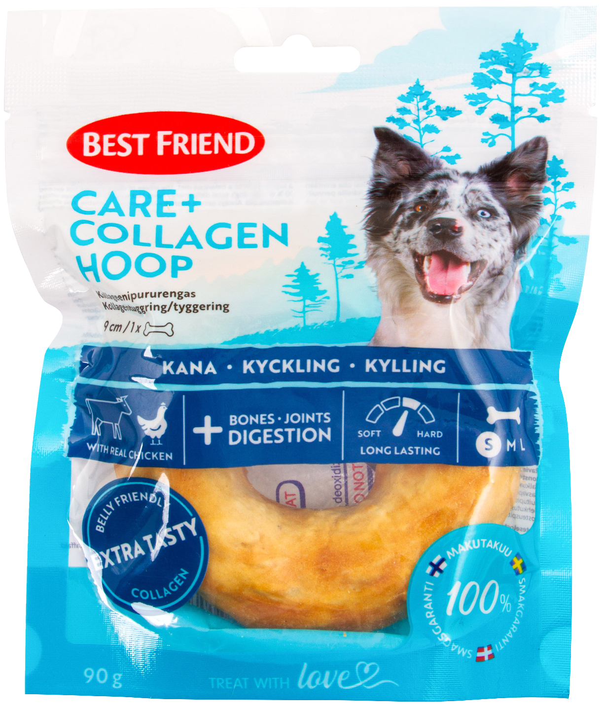 Best Friend Care+ Collagen Hoop on hauska ja herkullinen donitsin muotoinen pururengas koirille! Tämä rapea puruluu on valmistettu luonnollisista ainesosista, kuten kollageenista. Kollageeni auttaa tukemaan luita ja niveliä, ihoa ja turkkia sekä koirien yleistä hyvinvointia. Kollageenipururenkaamme tarjoaa maukkaan pureskelukokemuksen, jonka avulla koira voi purkaa luontaista pureskelun tarvetta. Maukas kana lisää houkuttelevuutta, ja innostaa entisestään koiraa järsimään luun viimeistä murua myöten! Care+ kollageenipururenkaassa on vähän rasvaa ja kaloreita, joten se on loistava valinta kaikenkokoisille ja -ikäisille koirille. Tarjoa koirallesi maukas kollageenipururengas hampaiden puhdistukseen, ajanvietteeksi ja rentoutumiseen – Treat with love.