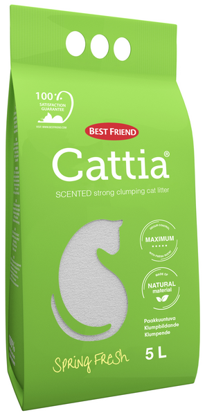 Best Friend Cattia Spring Fresh on luonnon materiaalista valmistettua, paakkuuntuvaa ja korkealaatuista kissanhiekkaa. Se on valmistettu valkoisesta luonnon bentoniitista, jossa on erittäin korkea montmorilloniittipitoisuus. Hiekkaan on lisätty mieto ja raikas hajuste. Korkealaatuisen materiaalin ja hienojakoisen koostumuksen ansiosta hajun- ja kosteudensitomiskyky on testatusti ylivoimaista perinteiseen bentoniittihiekkaan verrattuna, pitäen laatikon raikkaana ja hajuttomana. Kun hiekka aktivoituu, siitä vapautuu raikas tuoksu. Erinomainen paakkuuntuminen tekee hiekasta erittäin riittoisaa ja helppohoitoista käytössä. Hiekan vaihtaminen on miellyttävää, koska se on 99% pölytöntä.