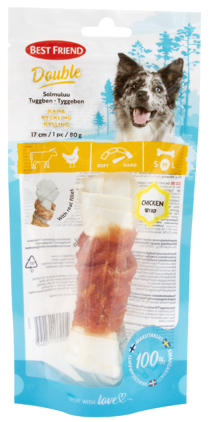 Best Friend Double solmuluu kanalla on herkullinen yhdistelmä korkealaatuista naudannahkaa ja aitoa kanafilettä. Sitkeä naudannahka antaa paljon haastetta hampaille ja maistuva kanafilee aktivoi koiraa ja saa nirsommankin koiran innostumaan pureskelusta. Double solmuluu kanafileellä on helposti sulava, sisältää runsaasti proteiinia ja vain vähän rasvaa. Solmuluu on erinomainen valinta keskikokoisille ja suurille koirille, joilla on keskivahva tai vahva puruvoima. Tuote sopii mainiosti myös pienemmille koirille, joilla on erittäin vahva puruvoima. Purutuotteiden säännöllinen käyttö auttaa ylläpitämään hampaiden ja ikenien terveyttä ja ehkäisemään samalla pahanhajuista hengitystä. Lisäksi purutuotteet tarjoavat erinomaista ajanvietettä ja piristävät tehokkaasti tylsiä hetkiä herättäen koirien luontaisen puruvietin.