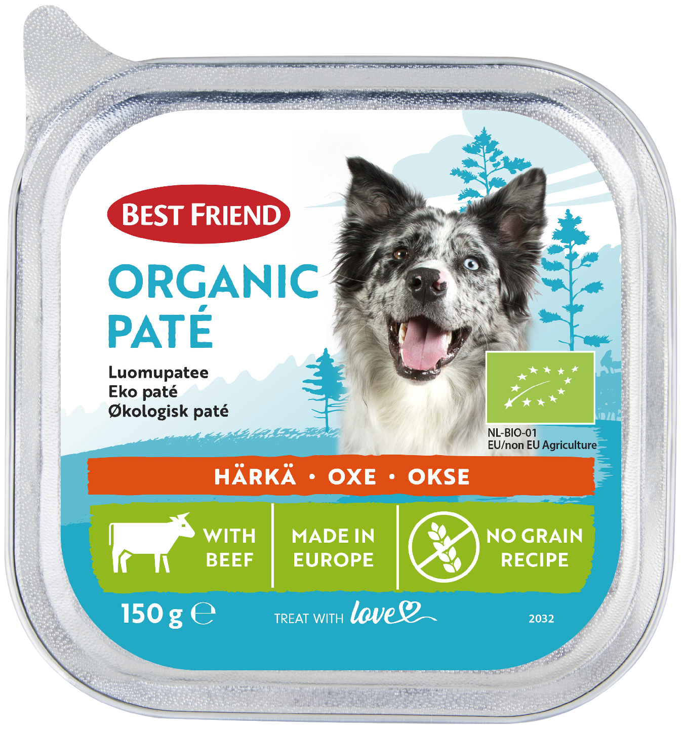 Best Friend Häränmakuinen luomupatee koirille on viljaton ja erittäin maistuva luomuruoka koirille. Tuote on valmistettu Euroopassa kunnioittaen luomutuotannon periaatteita. Kostea patee sopii erinomaisesti sellaisenaan tai kuivaruoan lisukkeena.