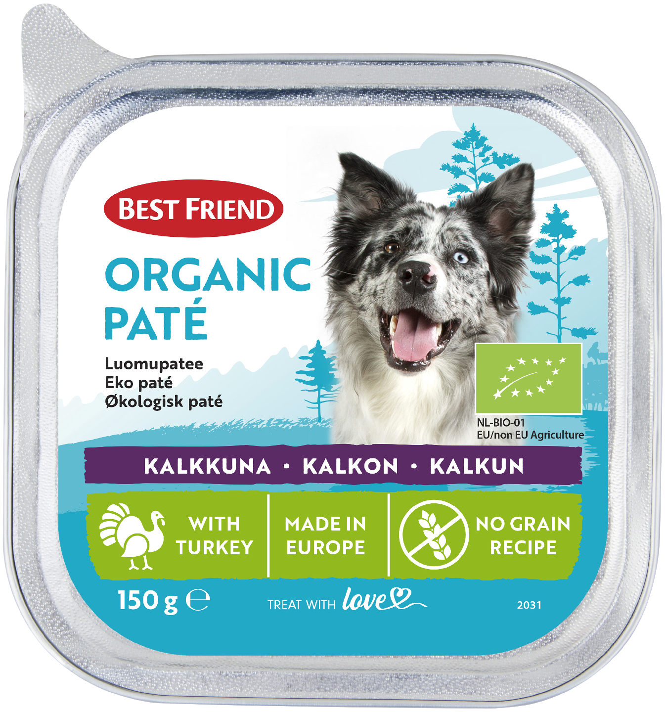 Best Friend Kalkkunanmakuinen luomupatee on viljaton ja erittäin maistuva luomuruoka koirille. Tuote on valmistettu Euroopassa kunnioittaen luomutuotannon periaatteita. Kostea patee sopii erinomaisesti sellaisenaan tai kuivaruoan lisukkeena.