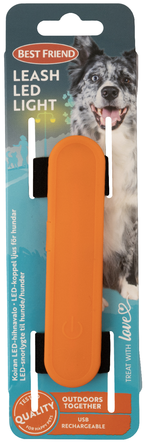 Lisänäkyvyyttä pimeiden kelien hihnalenkeille! Best Friend koiran LED-hihnavalo parantaa koiran näkyvyyttä ja lisää turvallisuuttaa pimeällä. Hihnavalo on vesitiivis ja sen voi kiinnittää velcrotarroilla helposti esim. taluttimeen tai valjaisiin. LED-hihanvalon näkyvyys on jopa 300 m, jolloin autoilijat ja tielläliikkujat huomaavat pimeällä ulkoilijat jo kaukaa. Valo syttyy ja sammuu painamalla valon päältä ja sen voi säätää joko tasaiseksi tai vilkkuvaksi valoksi. Valo kestää käytöstä riippuen noin 3-5 tuntia ilman latausta. Tuote on USB-ladattava ja paketti sisältää sekä valon että USB-kaapelin.
