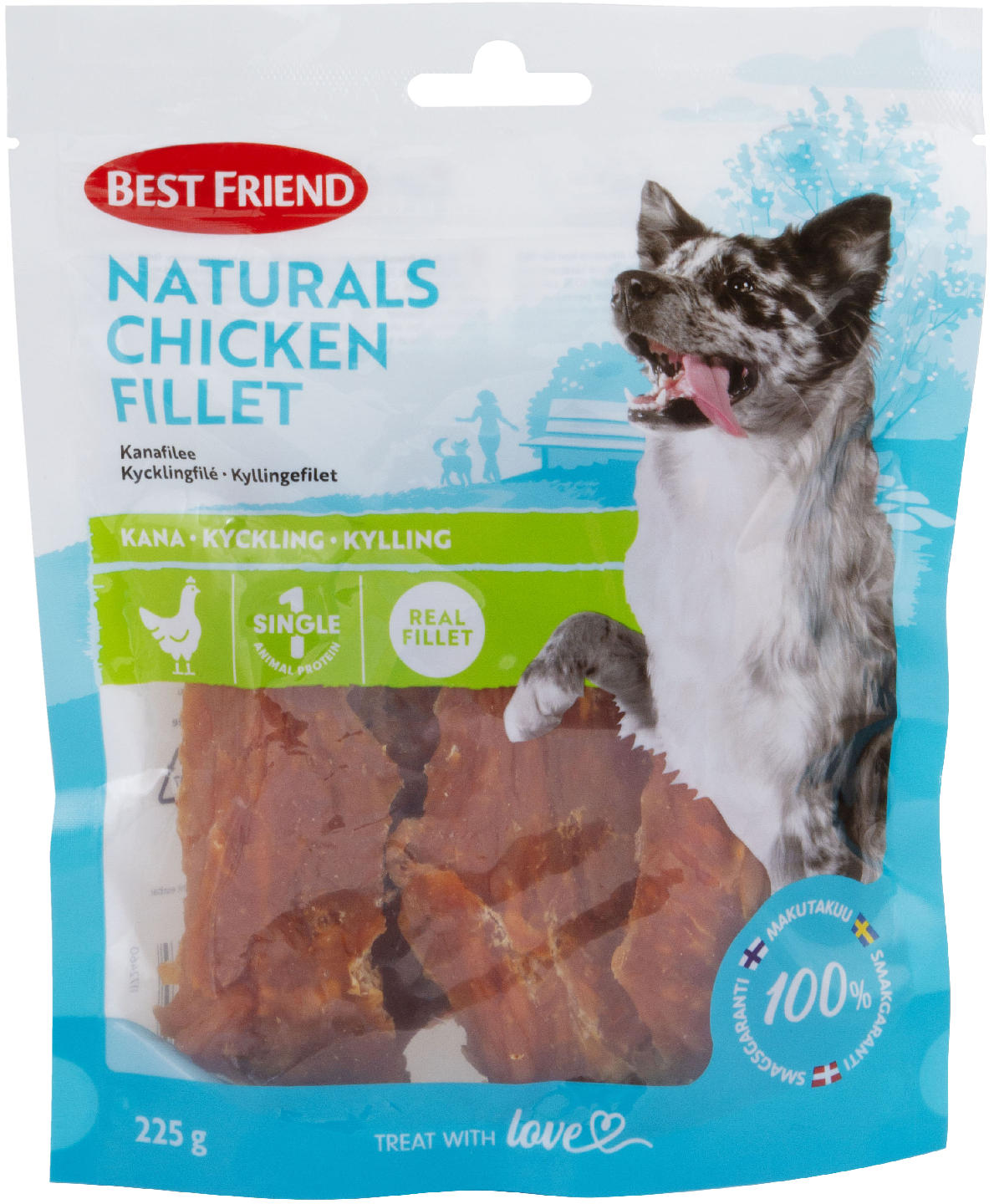 Best Friend Naturals Chicken Fillet kanafile on erittäin maukas, klassikko koiran herkku, joka sopii kaikille aikuisille koirille. Tämä perinteinen paahdettu koiran makupala sisältää paljon proteiinia vain yhdestä proteiinilähteestä; aidosta kanafileestä. Fileen koostumus ja suussa sulava maku houkuttelevat koiraa pureskelemaan tämän herkun viimeiseen palaan asti. Naturals Chicken Fillet kanafile ei sisällä viljaa, sokeria eikä lisäaineita, siksi tämä proteiinipitoinen herkku on loistava valinta kaikille koirille ja erilaisiin ruokavalioihin. Aidosta lihasta, broilerin rintafileistä, valmistettu koiran herkku on helppo pilkkoa ja siksi se sopii täydellisesti käytettäväksi mm. koiran koulutuksessa ja palkitsemisessa. Jos koira saisi päättää, hän valitsisi kanaa! Treat with love. Kätevä uudelleensuljettava pakkaus.