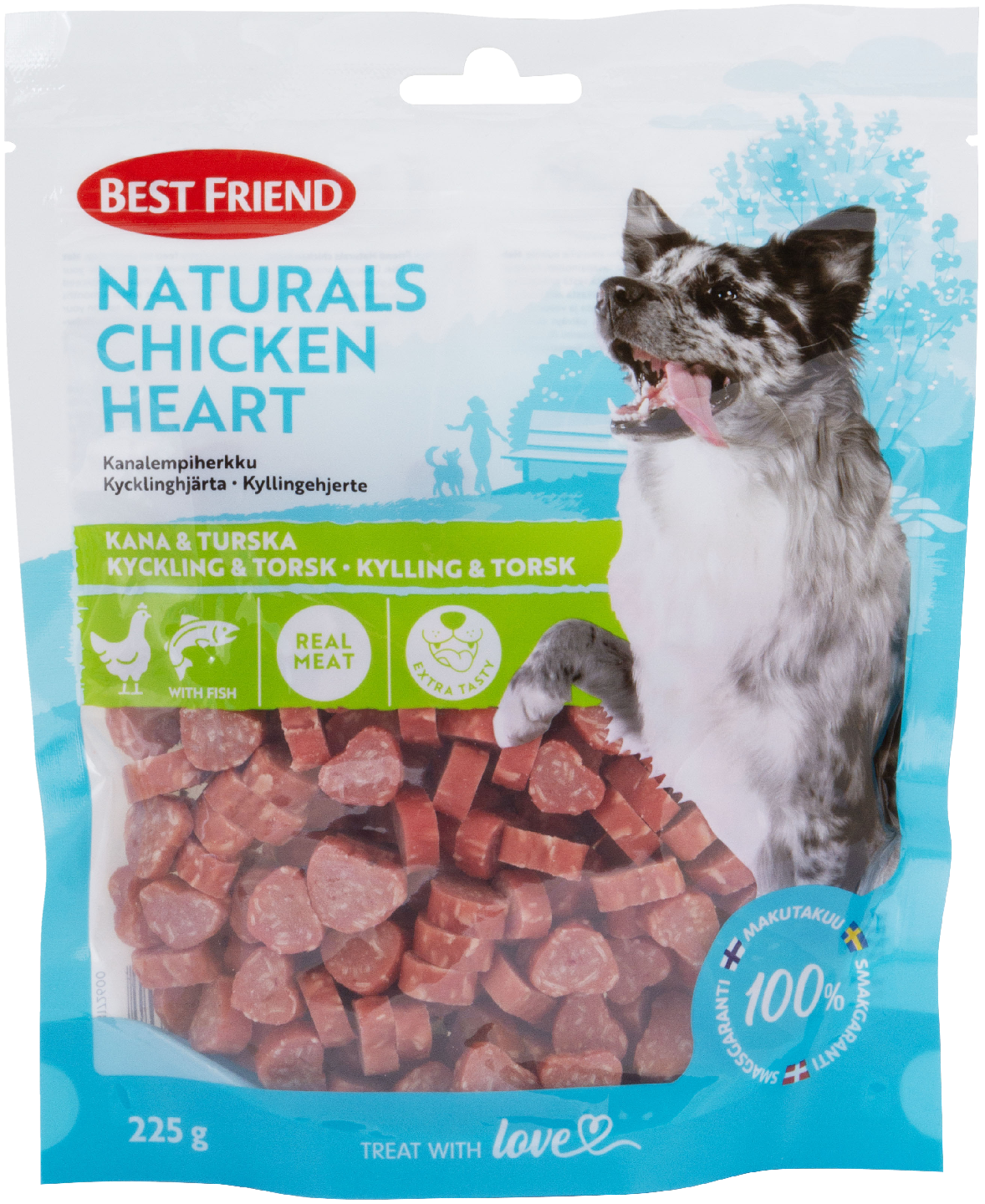 Best Friend Naturals Chicken Heart kanalempiherkku on super suloinen koiran makupala, joka sisältää runsaasti kanaa! Tämä sydämenmuotoinen koiran herkku sopii kaikille aikuisille koirille. Maistuvuutensa ja kokonsa ansiosta tämä koiran makupala sopii erinomaisesti myös koulutukseen. Natural Chicken Heart kanalempiherkku ei sisällä viljaa eikä lisättyä sokeria, vaan siinä on runsaasti proteiinia ja aitoa kanaa. Herkullinen turska lisää maistuvuutta ja hyviä rasvoja tähän makupalaan. Chicken Heart kanalempiherkku on erityisen maukas välipala parhaalle kaverillesi. Tämä nami on ehdottomasti rakkautta ensisilmäyksellä! Treat with love. Kätevä uudelleensuljettava pakkaus.