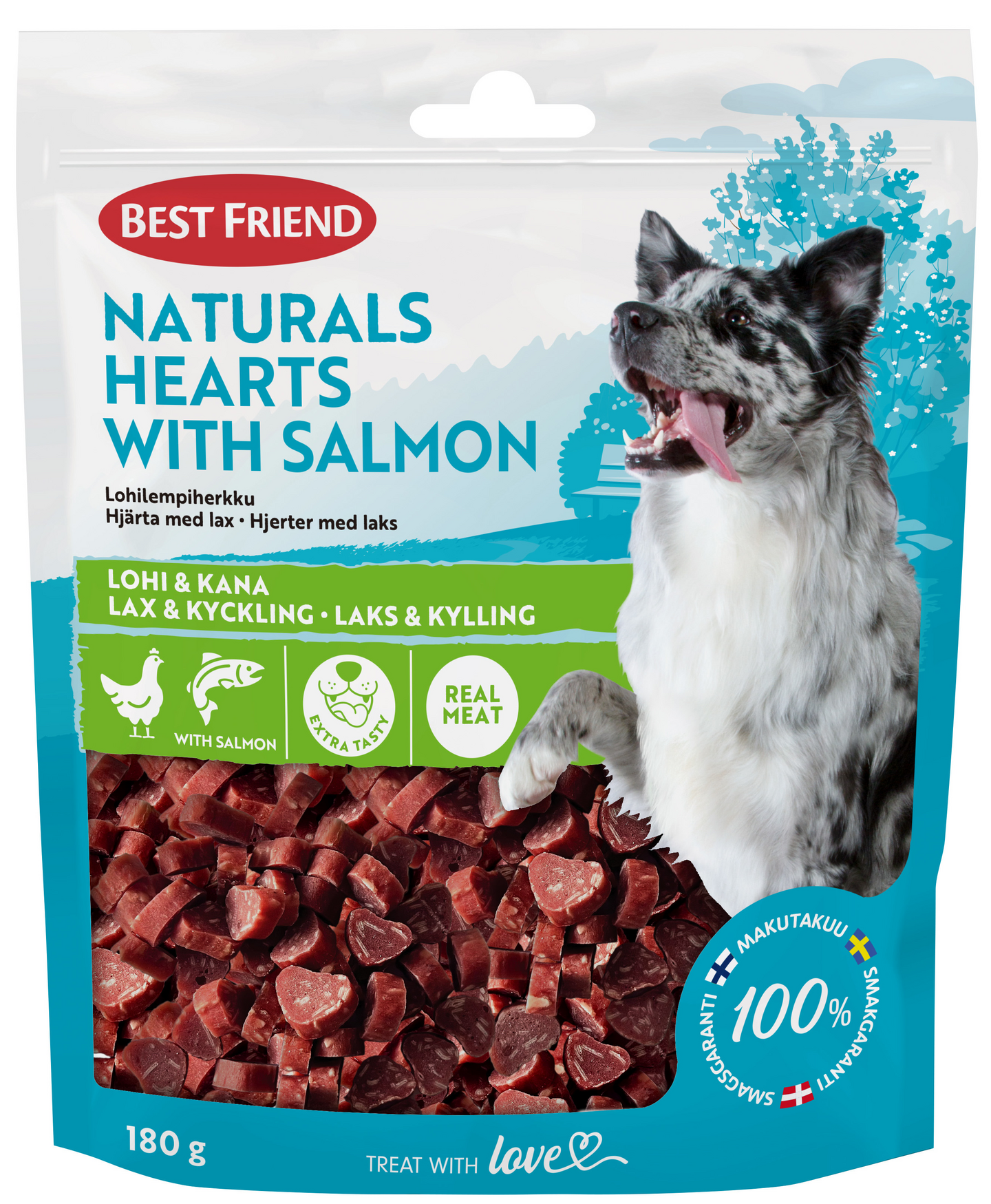 Best Friend Naturals Hearts with Salmon lohilempiherkku koiran makupala on maistuvan söpö herkku, joka sisältää runsaasti lohta! Tämä sydämenmuotoinen herkku sopii kaikenkokoisille aikuisille koirille. Laadukkaiden ja maistuvien ainesosiensa ansiosta tämä herkku on supermaukas. Söpö muoto ja pieni koko tekevät tästä koiran herkusta myös täydellisen harjoitteluun. Sokeriton ja viljaton lohilempiherkku sisältää runsaasti proteiinia aromikkaasta lohesta ja maukkaasta kanasta. Herkullinen lohi lisää koiran makupalaan myös hyviä rasvoja. Lohilempiherkku on erityisen maistuvaa sinun parhaalle ystävällesi. Tämä herkku on ehdottomasti rakkautta ensisilmäyksellä! Runsas 180 g:n pakkauskoko ja kätevä uudelleensuljettava pakkaus.