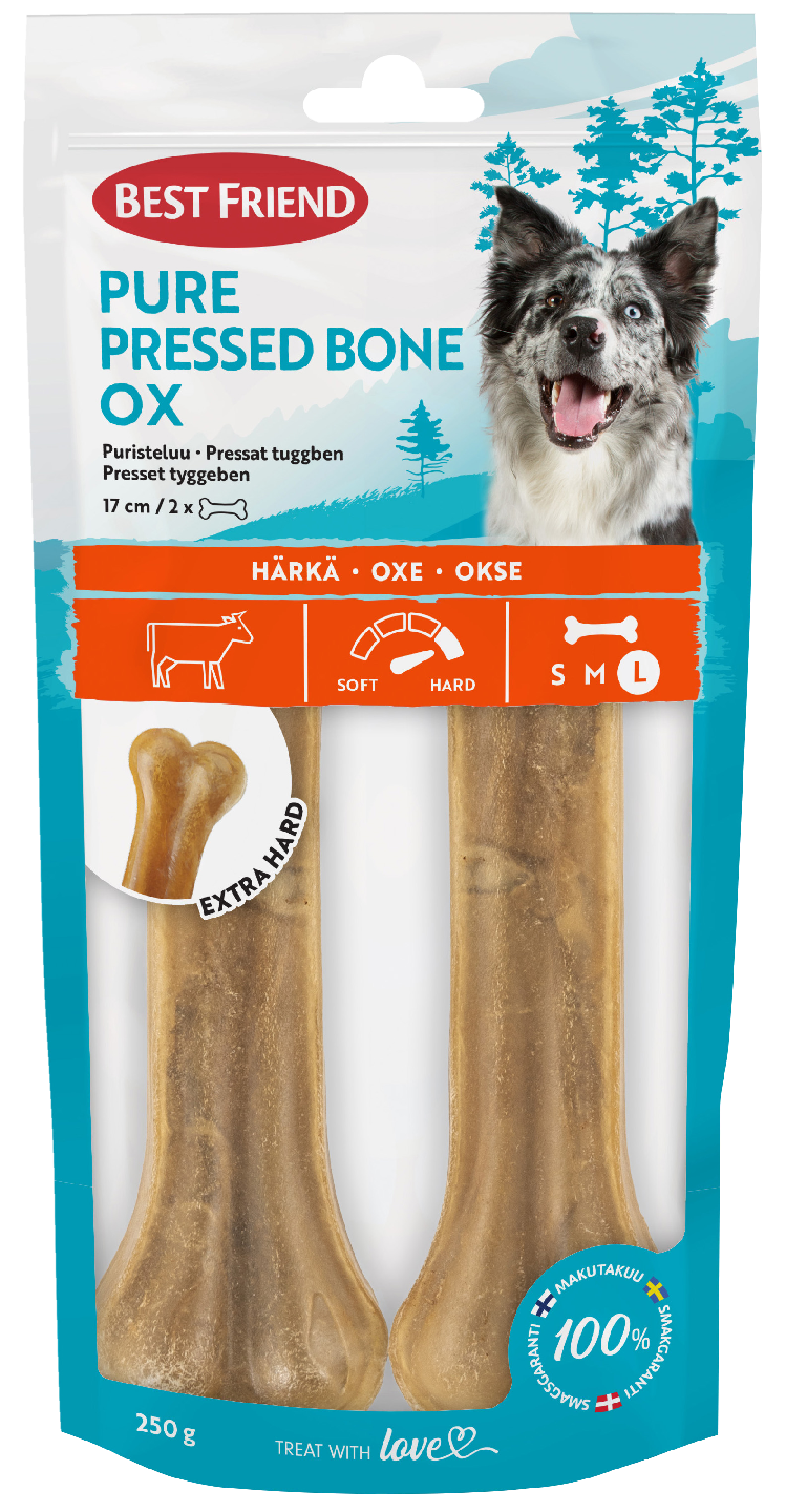 Best Friend Pure Pressed Bone Ox puristeluu on valmistettu erittäin maukkaasta naudannahasta ja se tarjoaa parhaan mahdollisen haasteen kovimmillekin pureskelijoille. Nämä pitkäkestoiset puruluut sopivat erinomaisesti isokokoisille koirille, joilla on voimakas puruvoima. Näiden erittäin kovien luiden luontaisen kova koostumus, ilman vehnää ja ilman lisättyä sokeria, pitää koirasi kiinnostuneena luun pureskelusta pitkään. Puristeluut tarjoavat vertaansa vailla olevan haasteen koirasi hampaille ja auttavat ylläpitämään hampaiden ja ikenien terveyttä sekä ehkäisemään pahanhajuista hengitystä. Puruluut ovat myös erinomaista viihdettä ja piristävät tehokkaasti koiraasi tylsinä hetkinä ja herättävät samalla koiran luonnollisen puruvietin. Nämä koiran puruluut ovat puhdasta herkkua parhaalle ystävällesi! Treat wit love. Kätevä uudelleen suljettava pakkaus.
