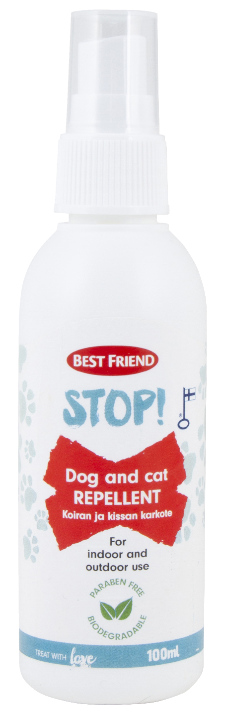 Suomessa valmistetun Best Friend STOP-karkotteen haju saa kissat ja koirat välttämään karkotteella käsiteltyjä paikkoja. Tuotetta voi käyttää sekä sisällä että ulkona. Sisätiloissa vaikutus kestää 2-4 viikkoa.Tuote on valmistettu turvallisista ja ympäristöystävällisistä, biohajoavista ainesosista. Tuote on kuitenkin hyvä pitää lasten ulottumattomissa. Jos STOP-karkotetta joutuu silmiin, huuhdo silmät perusteellisesti vedellä. Ei sisällä parabeeneja. Suihkepullo 100 ml. Avainlippu-tuote.