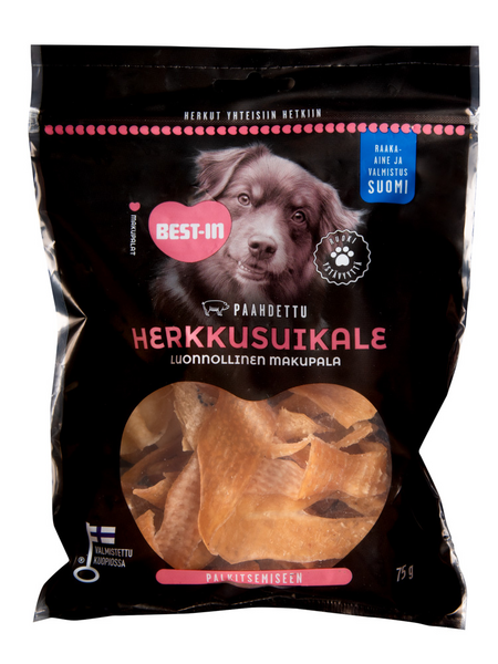 Best-In Herkkusuikale on suomalainen makupala, joka on valmistettu 100% suomalaisesta siasta. Best-In –makupalojen herkullisuus piilee puhtaissa, suomalaisissa raaka-aineissa ja hellävaraisessa kypsennyksessä. Herkut paahdetaan rapeaksi uunissa ja pakataan tämän jälkeen ilmatiiviisin pakkauksiin. Valmistusmenetelmä takaa tuotteen säilyvyyden – eikä säilöntä-, lisä- tai väriaineita tarvita. Toimimme Ruokaviraston valvonnan alla ja tuotteiden sekä toiminnan laadun takeena meillä on laatu- ja ympäristösertifikaatit.