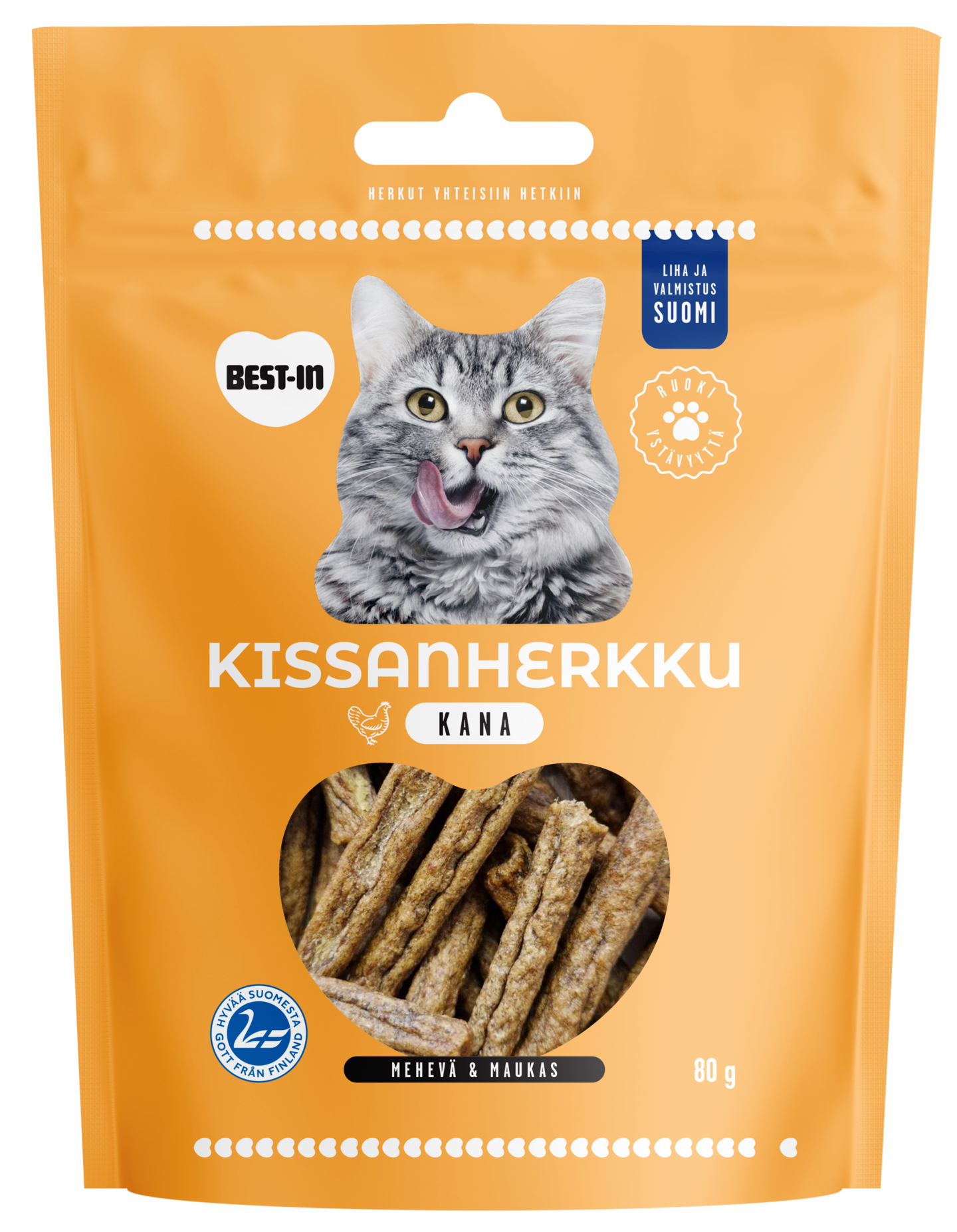 Best-In Kissanherkku kana on 100% suomalaisesta kananlihasta valmistettu puolikostea, tikun muotoinen herkkupala. Seinäjoella rakkaudella ja ammattitaidolla valmistettu Kissanherkku tarjoaa kissallesi juuri sitä, mitä se tarvitsee – runsaasti proteiinia ja luonnollista makua. Pehmeän koostumuksen ansiosta herkku on helppo tarjota ja käyttää aktivointiin tai herkutteluun. Hemmottele kissaasi suomalaisella Kissanherkulla!