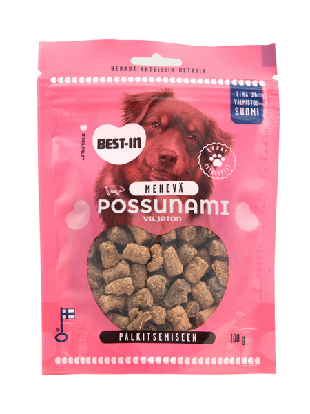 Mehevän makoisa uutuus! Best-In Mehevä Possunami on 100 % suomalaisesta liharaaka-aineesta valmistettu puolikostea, pehmeä makupala. Koostumuksensa ansiosta koiran on helppo nautiskella mehevästä namista ja se sopiikin erinomaisesti koulutukseen, aktivointiin ja palkitsemiseen. Lihaisa Possunami sopii useimmille karvakuonoille, sillä se on täysin viljaton ja gluteeniton!