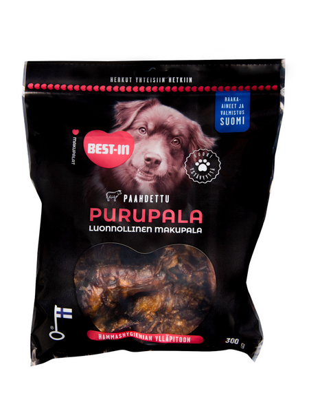 Best-In Purupalat on suomalainen makupala, joka on valmistettu 100% suomalaisesta naudasta. Best-In –makupalojen herkullisuus piilee puhtaissa, suomalaisissa raaka-aineissa ja hellävaraisessa kypsennyksessä. Herkut paahdetaan rapeaksi uunissa ja pakataan tämän jälkeen ilmatiiviisin pakkauksiin. Valmistusmenetelmä takaa tuotteen säilyvyyden – eikä säilöntä-, lisä- tai väriaineita tarvita. Toimimme Ruokaviraston valvonnan alla ja tuotteiden sekä toiminnan laadun takeena meillä on laatu- ja ympäristösertifikaatit.
