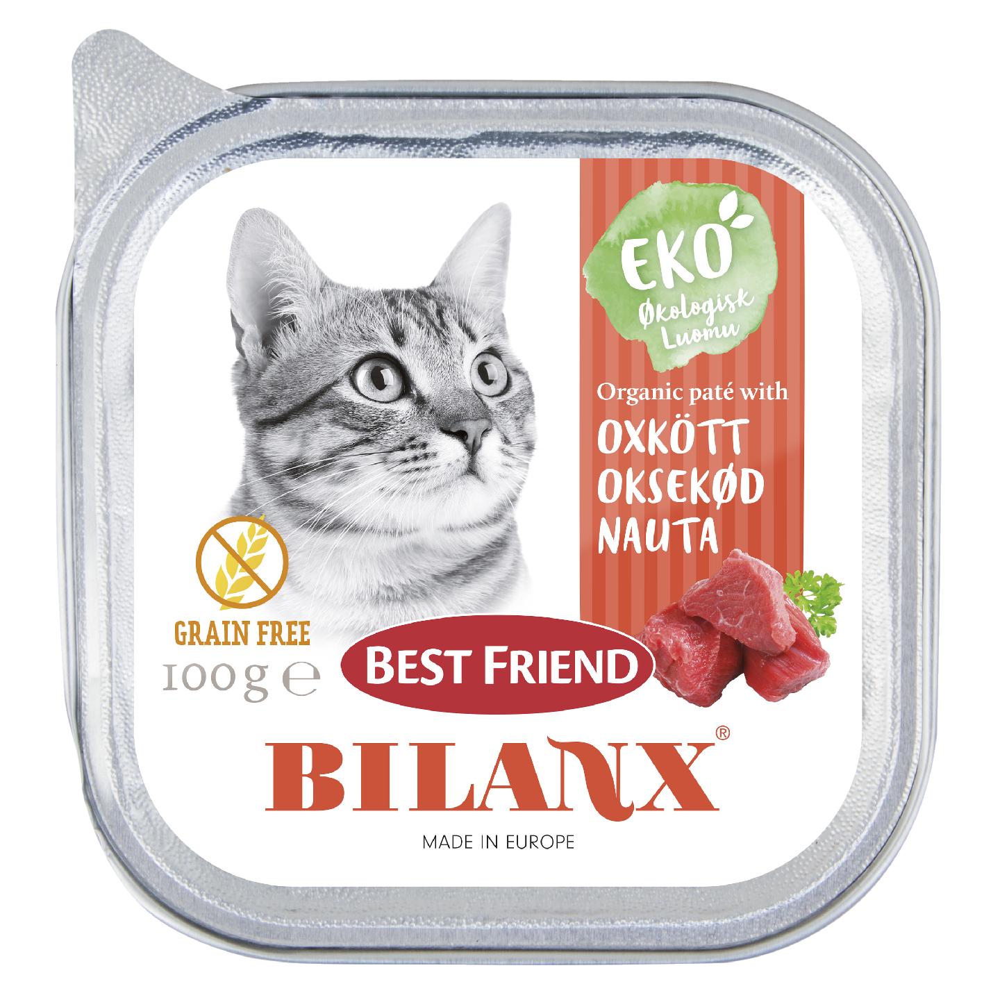 Best Friend Bilanx luomu nautapatee on viljaton ja testatusti maistuva luomuruoka aikuisille kissoille. Valmistettu Euroopassa kunnioittaen luomutuotannon periaatteita. Bilanx - vain parasta kissallesi!