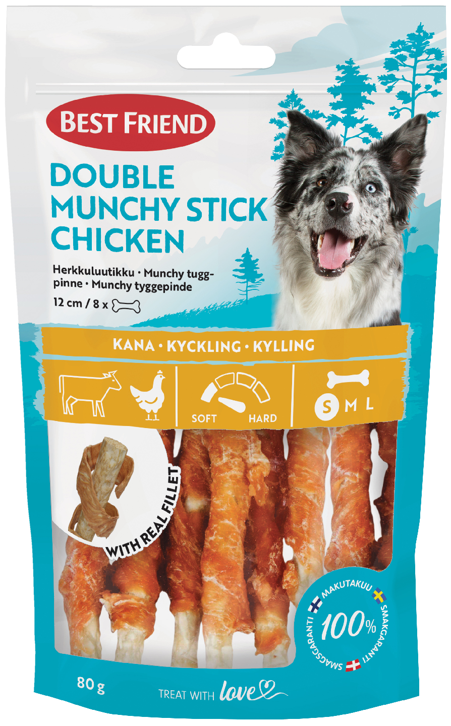 Best Friend Double herkkuluutikku käärittynä oikeaan kanafileeseen on herkullinen muunnelma klassisesta herkkuluutikusta, josta kaikki koirat pitävät! Vaikka herkkuluutikkujen rakenne on pehmeä, ne tarjoavat runsaasti pureskeltavaa koirille. Herkullinen kanafilee antaa makua ja saa jopa nirsoimmat koirat innostumaan puruluun järsimisestä. Nämä pureskeltavat herkut sopivat erityisesti pienille koirille, vanhoille koirille ja pennuille. Supermaukkaat herkkuluutikut kanafileellä ovat myös täydellisiä suuremmille koirille mm. palkkiona tai herkkuna puruluiden sijaan. Säännöllinen pureskelutuotteiden käyttö auttaa ylläpitämään hampaiden ja ikenien terveyttä sekä ehkäisemään pahanhajuista hengitystä. Pureskelutuotteet tarjoavat myös erinomaista viihdykettä ja virkistävät koiraasi tehokkaasti tylsinä hetkinä, samalla kun ne herättävät luonnollisen puruvietin. Herkkuluu päivässä piristää! Treat with love. Kätevä uudelleensuljettava pakkaus.