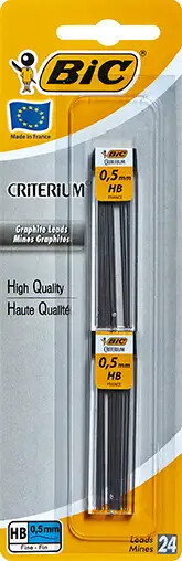BIC HB 0,5mm irtolyijyt lyijytäytekyniin. Pakkauksessa on 2 tuubia, joissa kussakin 12 kpl 0,5mm HB-lyijyä.