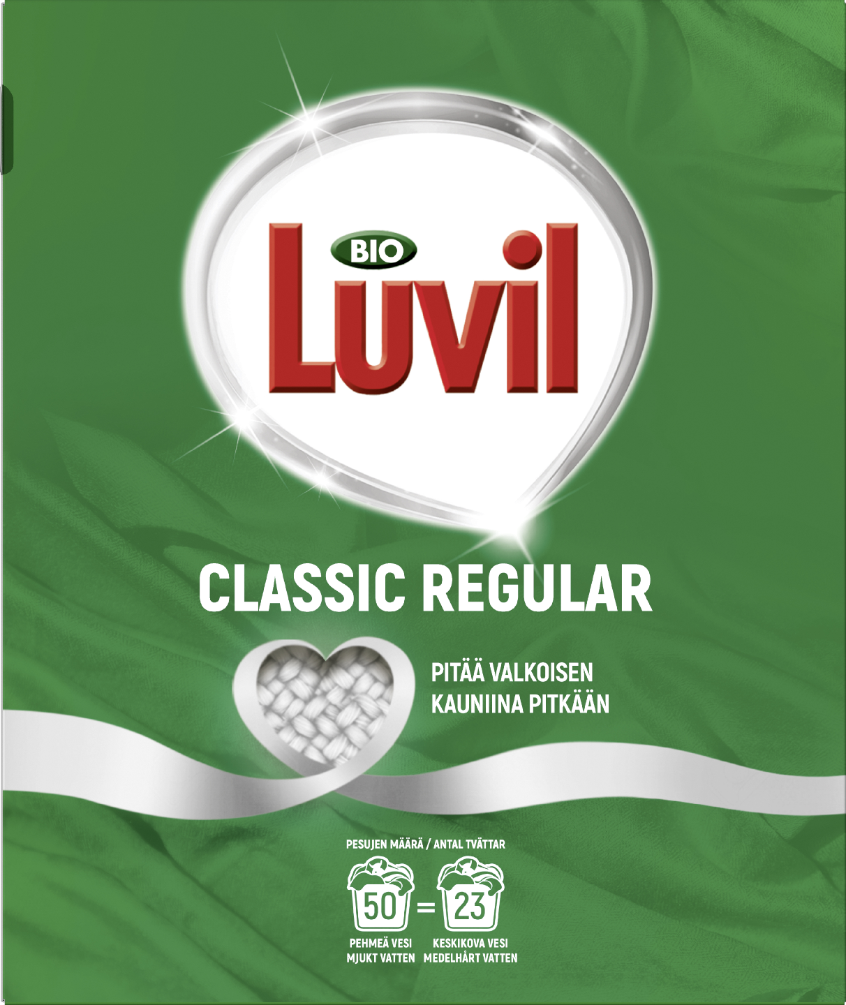 Bio Luvil Classic -pyykinpesujauhe sopii yleispyykin pesuun, mutta on erityisen tehokas valkopyykin pesuaine valkoisille vaatteille. Pitää valkoiset vaatteet kauniina pitkään. Pesutulos on valkoinen ja raikas jokaisella pesukerralla. Raikas Bio Luvil -tuoksu ja suomalaisiin oloihin sopiva koostumus tekevät tästä pesujauheesta suomalaisten kestosuosikin.Bio Luvil huolehtii vaatteistasi, se vie mennessään pinttyneeet ja vaikeat tahrat. Pesun jälkeen pyykkiisi jää raikkaan puhdas tuoksu. Monipuolisesta Bio Luvil -pyykinpesutuotesarjasta löydät jokaiseen tarpeeseen ja kullekin tekstiilille sopivan pesuaineen. Villaa tai silkkiä, kirjavaa, tummaa tai sporttista vaatetta, Bio Luvililta löydät ratkaisun, jolla saat pyykkisi puhtaaksi oikeaoppisesti ja pidät parasta huolta rakkaista vaatteistasi.Jos ihosi on herkkä reagoimaan ja haluat suojata omaa ja perheenjäsentesi ihoa, suosittelemme Bio Luvil Sensitive -pyykinpesuaineita. Ne eivät sisällä hajusteita eikä väriaineita. Sensitive-pesuaineiden ainesosat ja niiden pitoisuudet eivät yleisesti ärsytä tai herkistä, siksi ne sopivat myös herkkäihoisille sekä pienten lasten vaatteiden pesuun.Bio Luvil on Suomen toiseksi suosituin pyykinpesuainemerkki ja pyykinhuollon asiantuntija, johon suomalaiset luottavat. Bio Luvil tuli markkinoille jo vuonna 1962 ja sitä valmistettiin alun perin paikallisesti. Suomalaiset yhdistävät edelleen Bio Luviliin perinteikkyyden, pitkän tradition ja korkean laadun. Historiallisesti Bil Luvil tunnetaan erityisesti tehokkuudestaan vaikeiden tahrojen poistajana. Pitkään Bio Luvil oli myös ainoa nestemäinen pyykinpesuaine, jonka koostumus myös hoiti vaatteita. Vuodesta 2021 alkaen Bio Luvilia on saanut myös helppokäyttöisinä pesukapseleina.