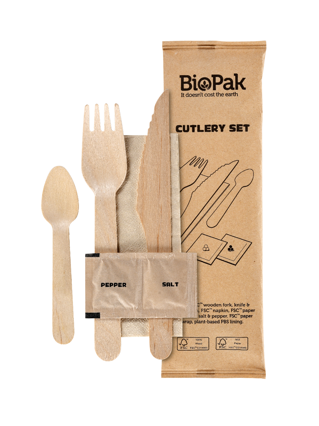 Biopak Aterinpakkaus: vahattu puuhaarukka, -veitsi, -kahvilusikka, lautasliina, suola, pippuri 210mm